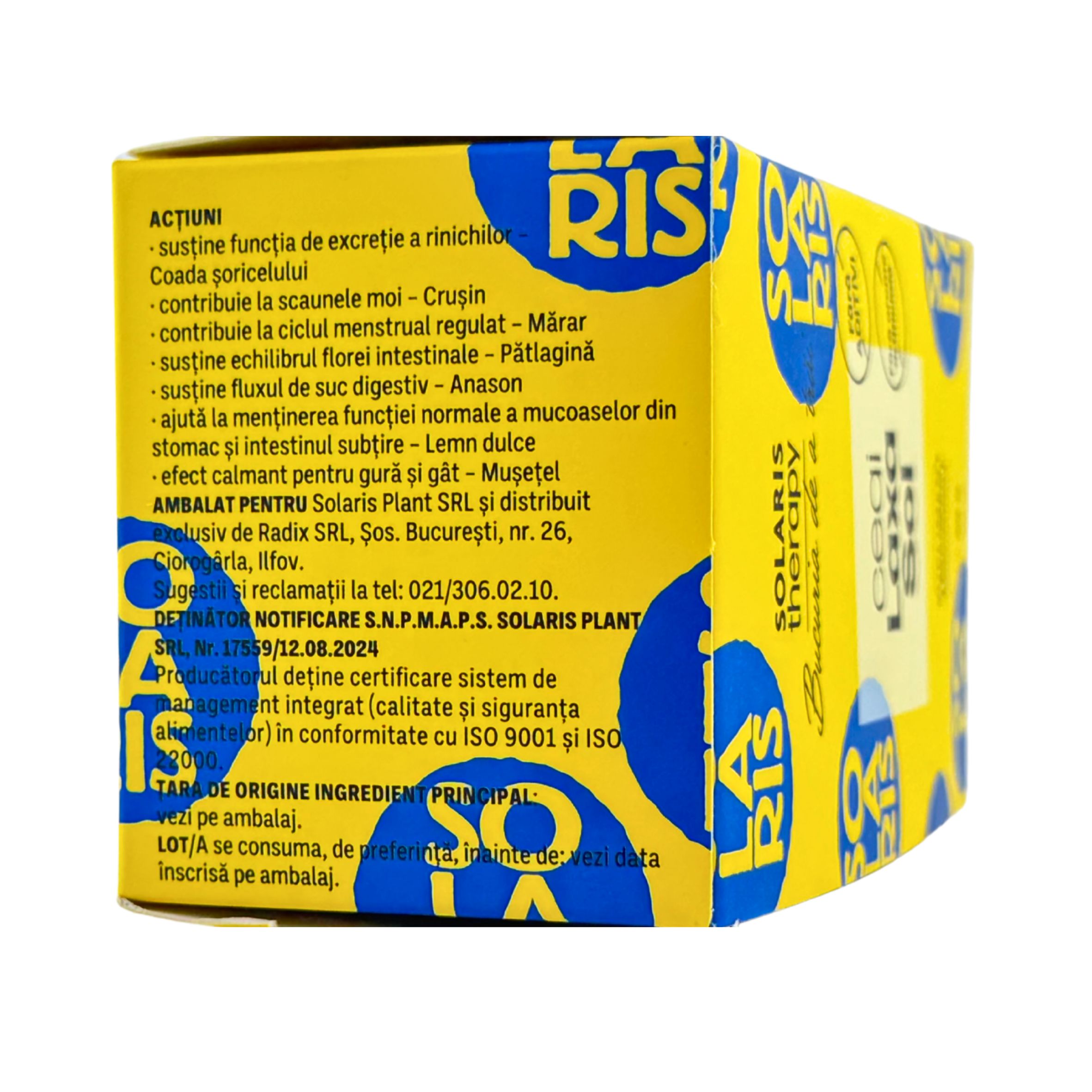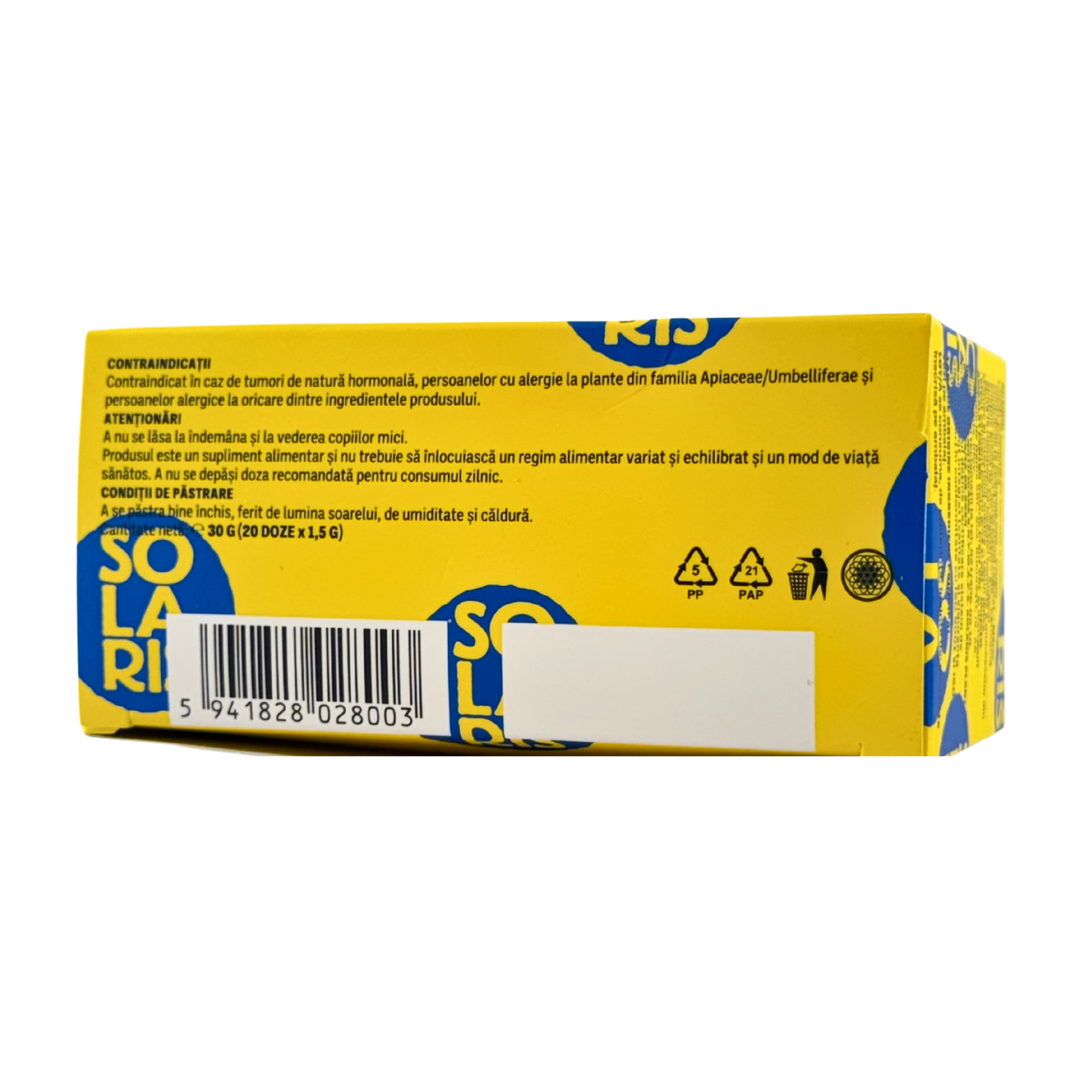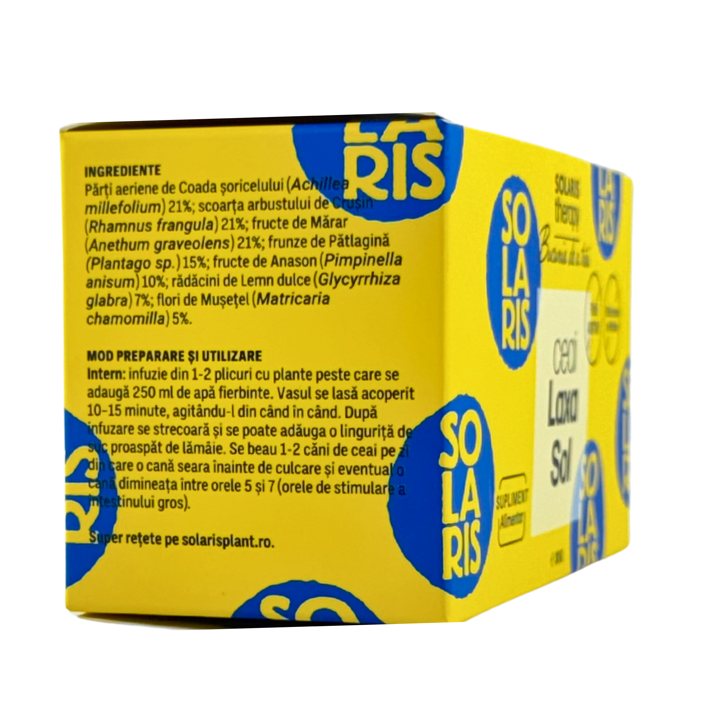 Ceaiul Laxasol Solaris este o combinație echilibrată de plante atent selecționate, care contribuie la funcționarea normală a tranzitului intestinal și contribuie la menținerea confortului digestiv. Formula pe bază de plante contribuie la procesele naturale de eliminare ale organismului și contribuie la echilibrul sistemului digestiv, fiind recomandată ca parte a unui stil de viață echilibrat.
