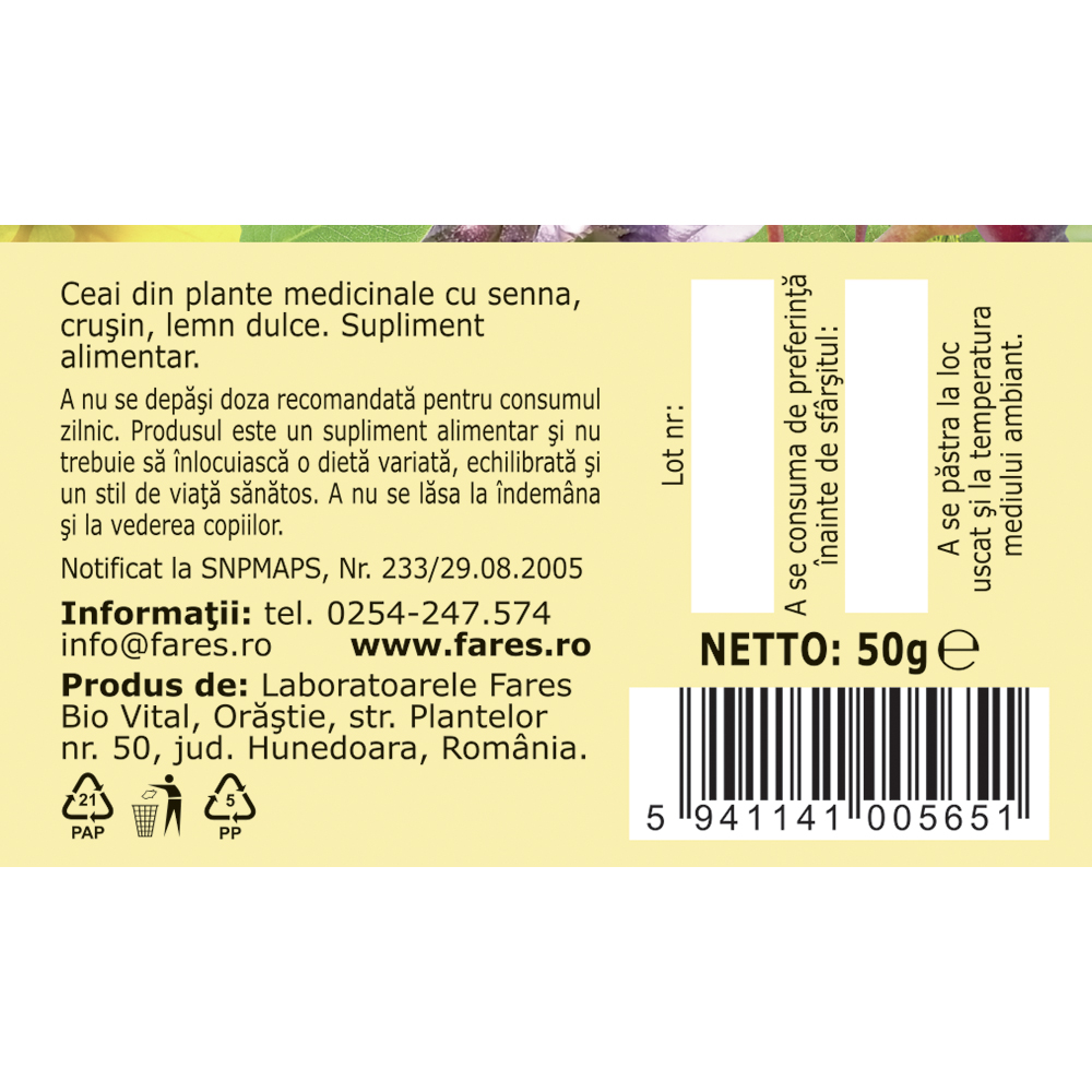 Ceaiul Laxativ D76 de la Fares este un supliment alimentar pe baza de plante atent selectionate, care contribuie la sustinerea tranzitului intestinal normal si la mentinerea confortului digestiv.