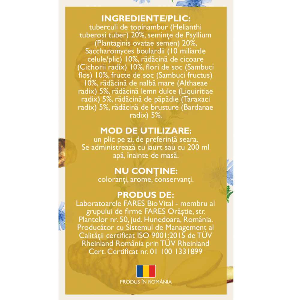 Tuberculi de topinambur (Helianthi tuberosi tuber) 20%, seminţe de Psyllium (Plantaginis ovatae semen) 20%, Saccharomyces boulardii (10 miliarde celule/plic) 10%, rădăcină de cicoare (Cichorii radix) 10%, flori de soc (Sambuci flos) 10%, fructe de soc (Sambuci fructus) 10%, rădăcină de nalbă mare (Althaeae radix) 5%, rădăcină lemn dulce (Liquiritiae radix) 5%, rădăcină de păpădie (Taraxaci radix) 5%, rădăcină de brusture (Bardanae radix) 5%.