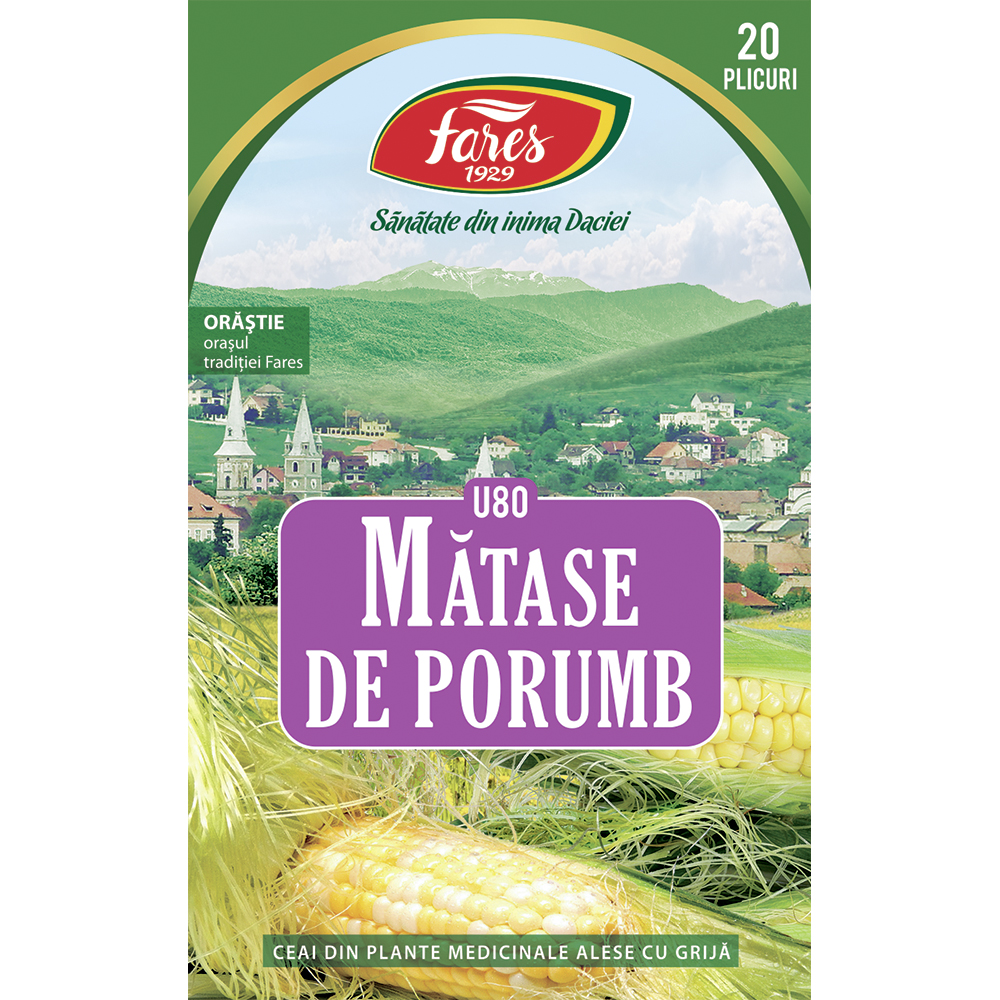 Ceaiul de Mătase de Porumb Fares U80 este un supliment alimentar pe bază de plante, obținut din stigmate de porumb, recunoscute pentru conținutul lor în flavonoide. Produsul este destinat consumului zilnic, pentru completarea unei diete echilibrate.
