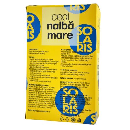Ceaiul de Nalbă mare Solaris este obținut din părți aeriene atent selecționate, care contribuie la menținerea confortului la nivelul gurii și gâtului și contribuie la funcționarea normală a sistemului digestiv. Consumul regulat contribuie la menținerea funcțiilor intestinale normale și contribuie la starea generală de bine, fiind potrivit atât pentru utilizare internă, cât și externă.