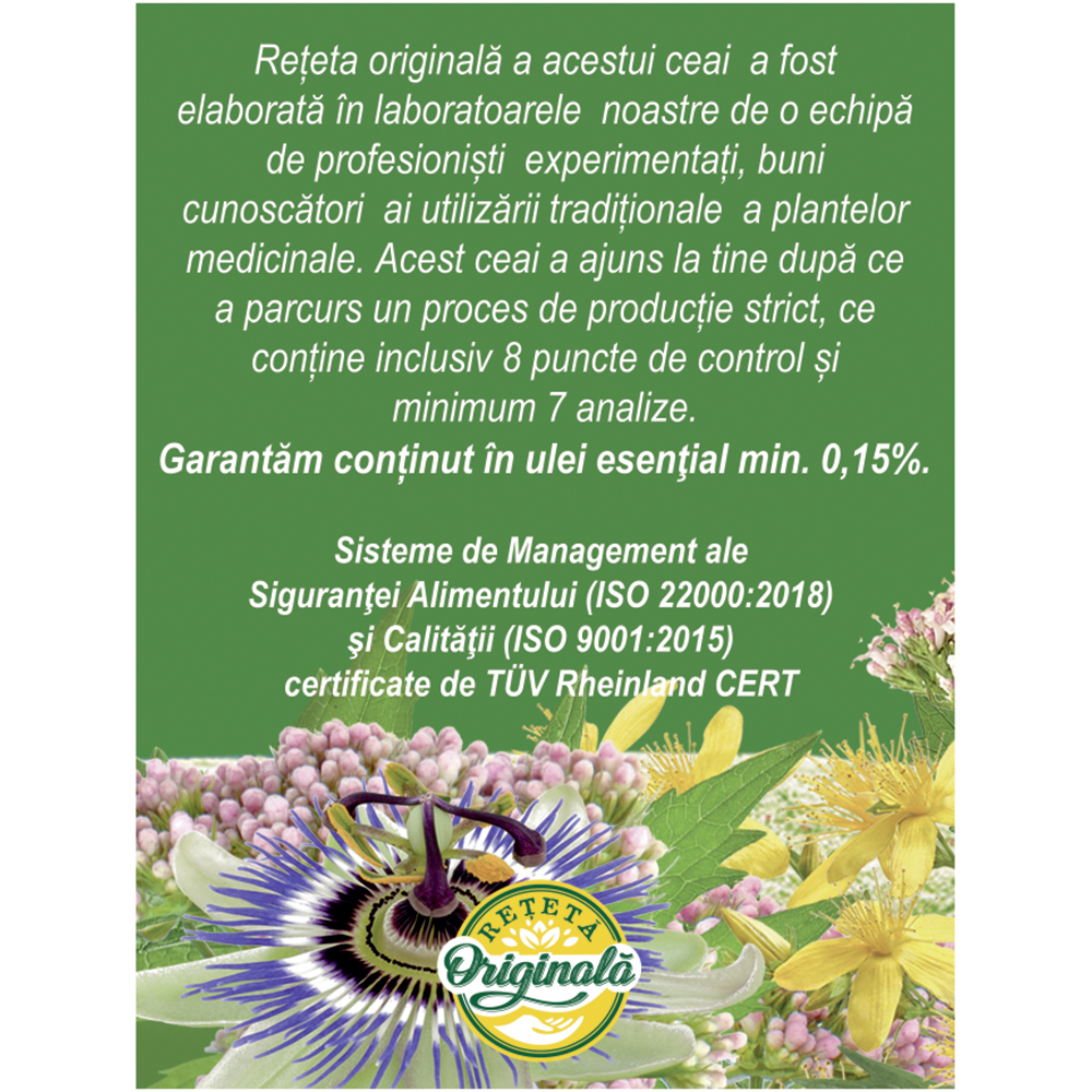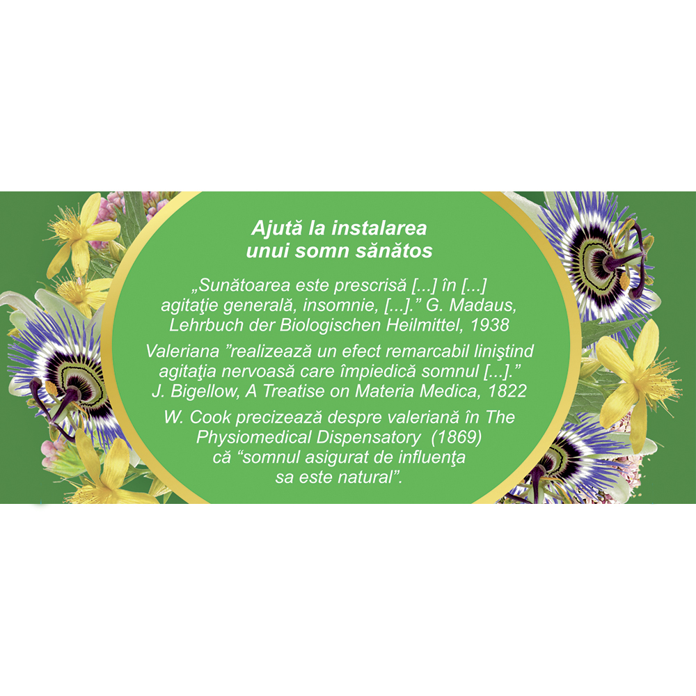 Sunatoare (Hyperici herba) 15%, roinita (Melissae herba) 15%, radacina de valeriana (Valerianae radix) 15%, conuri de hamei (Lupuli strobuli) 15%, sulfina (Meliloti herba) 10%, maghiran (Majoranae herba) 10%, flori de tei (Tiliae flos) 5%, passiflora (Passiflorae herba) 5%, flori de lavanda (Lavandulae flos) 5%, mac californian (Eschscholziae herba) 5%.