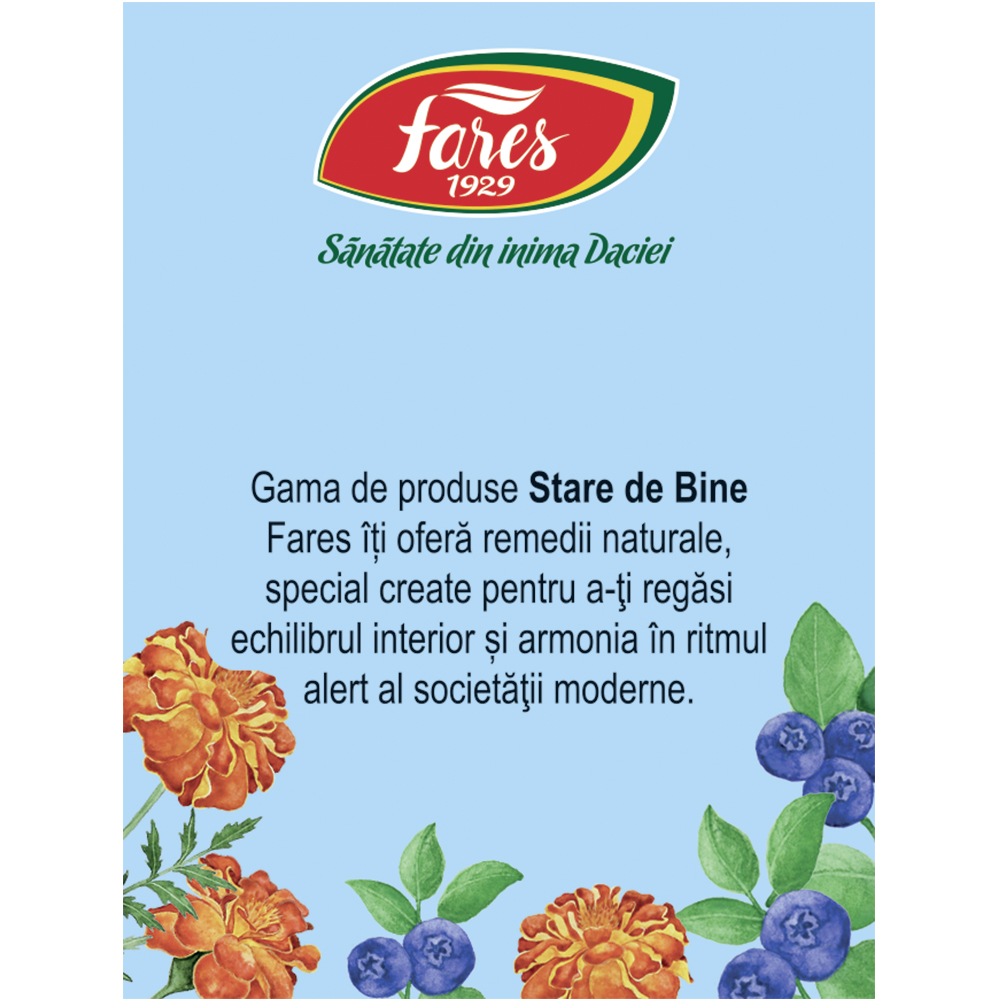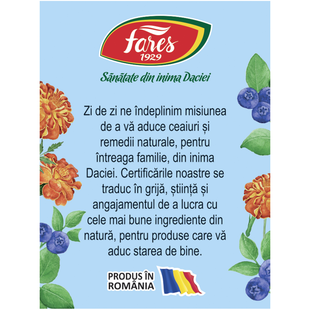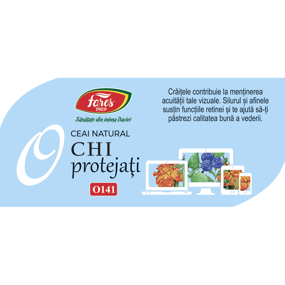 Suplimentul alimentar Ochi protejați de la Fares 1929 este un ceai natural din plante medicinale, formulat pentru a contribui la menținerea calității bune a vederii. Conține o combinație de crăițe, afine și alte fructe și plante.