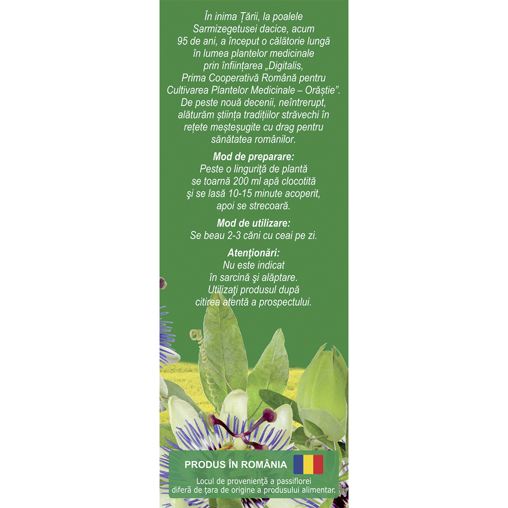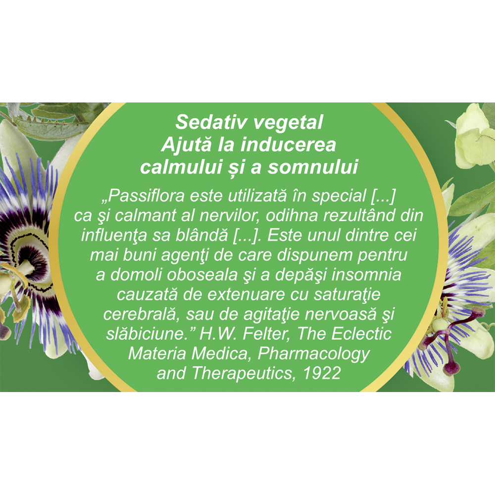 Partea aeriană a plantei Passiflora incarnata L. conţine în principal derivaţi de benzoflavonă, flavonoide, ulei esenţial, β-carbolin, alcaloizi (harman, harmol, harmalol).