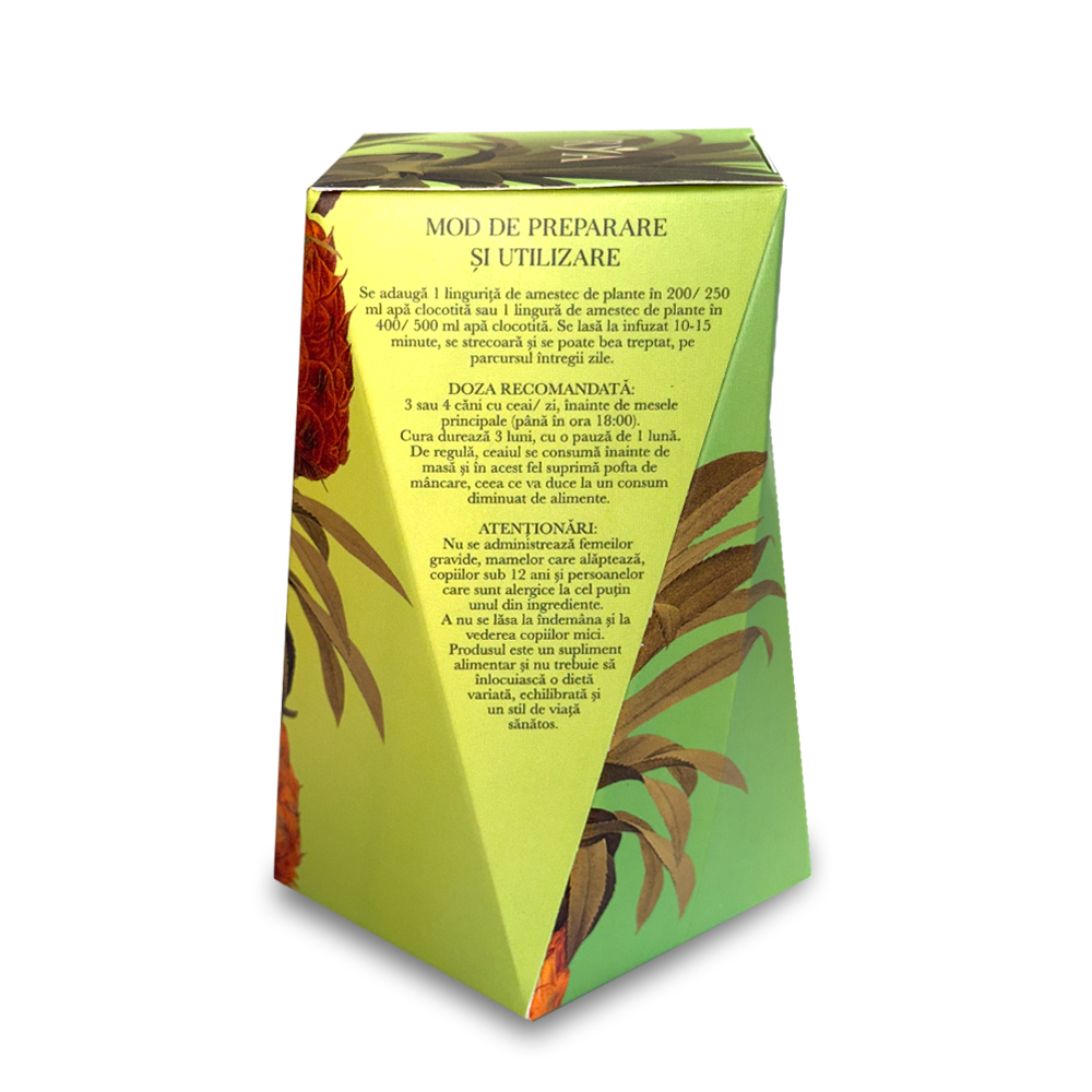 Mod de preparare: Se adaugă 1 linguriţă de amestec de plante în 200/250 ml apă clocotită sau 1 lingură de amestec de plante în 400/500 ml apă clocotită. Se lasă la infuzat 10-15 minute, se strecoară şi se poate bea treptat, pe parcursul întregii zile.