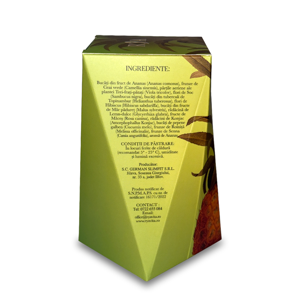 Bucăţi din fruct de Ananas (Ananas comosus), frunze de Ceai verde (Camellia sinensis), părțile aeriene ale plantei Trei-frați-pătați (Viola tricolor), flori de Soc (Sambucus nigra), bucăţi din tuberculi de Topinambur (Helianthus tuberosus), flori de Hibiscus (Hibiscus sabdariffa), bucăţi din fructe de Măr pădureţ (Malus sylvestris), rădăcină de Lemn-dulce (Glycyrrhiza glabra), fructe de Măceș (Rosa canina), rădăcini de Konjac (Amorphophallus konjac), bucăţi de Pepene galben (Cucumis melo), frunze de Roiniță (Melissa officinalis), frunze de Senna (Cassia angustifolia), aromă de Ananas.