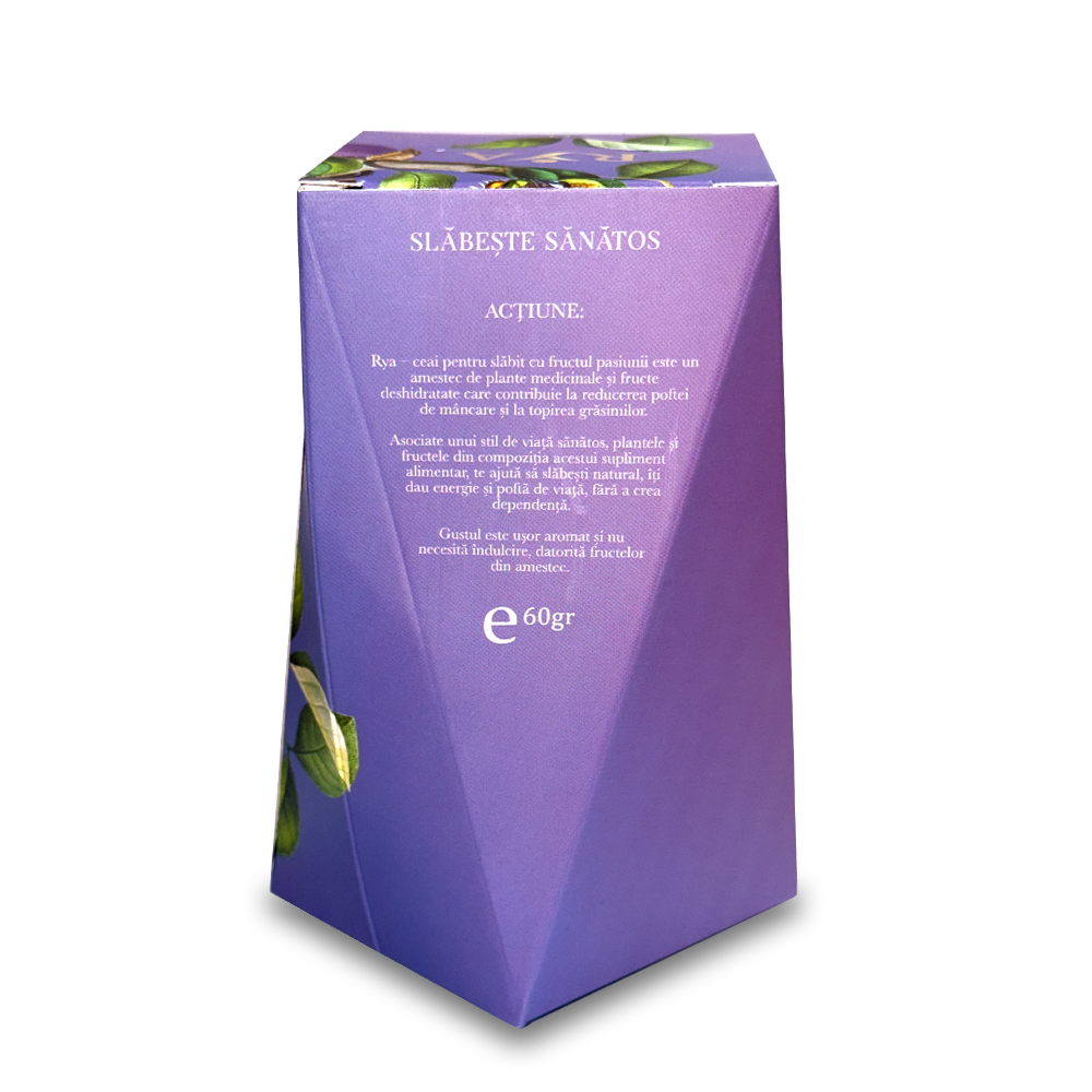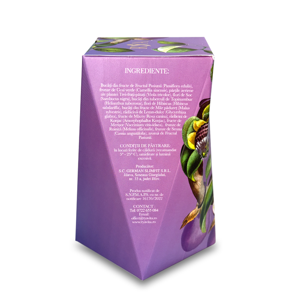 Bucăţi din fructe de Fructul Pasiunii (Passiflora edulis), frunze de Ceai verde (Camellia sinensis), părţile aeriene ale plantei Trei-frați-pătați (Viola tricolor), flori de Soc (Sambucus nigra), bucăți din tuberculi de Topinambur (Helianthus tuberosus), flori de Hibiscus (Hibiscus sabdariffa), bucăţi din fructe de Măr pădureț (Malus sylvestris), rădăcină de Lemn-dulce (Glycyrrhiza glabra), fructe de Măceș (Rosa canina), rădăcini de Konjac (Amorphophallus konjac), fructe de Merișor (Vaccinium vitis-idaea), frunze de Roiniță (Melissa officinalis), frunze de Senna (Cassia angustifolia), aromă de Fructul Pasiunii.