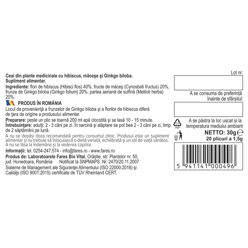 flori de hibiscus (Hibisci flos) 40%, fructe de măceș (Cynosbati fructus) 20%, frunze de Ginkgo biloba (Ginkgo folium) 20%, partea aeriană de sulfină (Meliloti herba) 20%