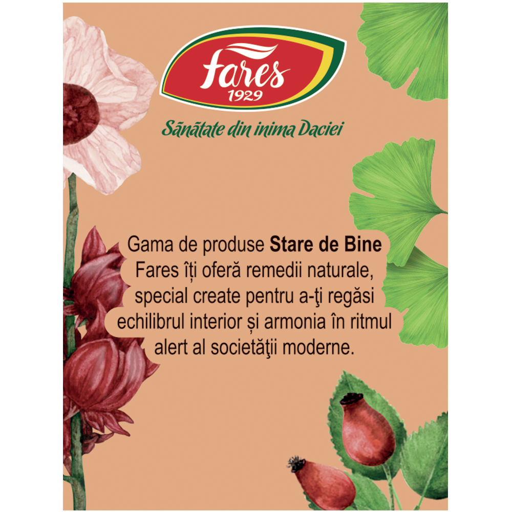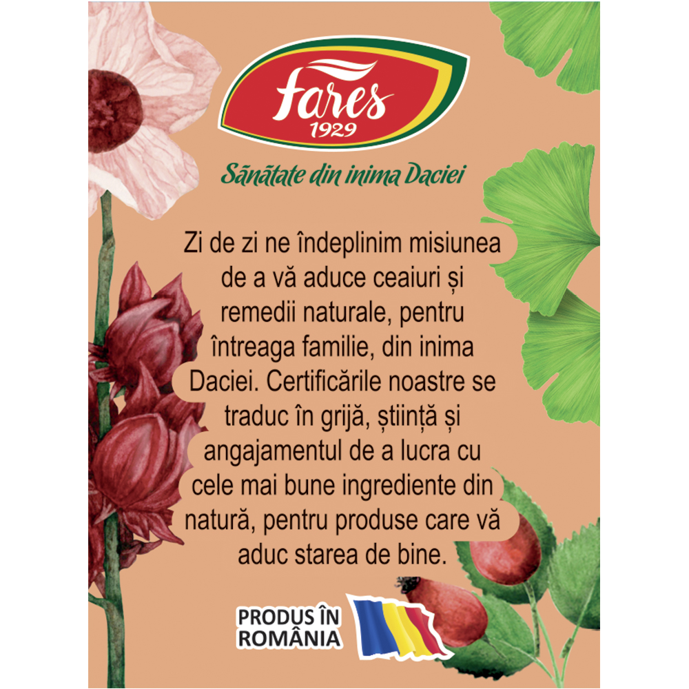 Ceaiul din plante medicinale cu hibiscus, măceșe și Ginkgo biloba este un amestec echilibrat de flori și frunze atent selecționate, cu un gust plăcut fructat și ușor floral. Hibiscusul și măceșele adaugă o notă acrișoară și revigorantă, completată de aroma discretă a sulfinelor și de frunzele de Ginkgo biloba. Este o alegere naturală pentru momentele de relaxare zilnică.