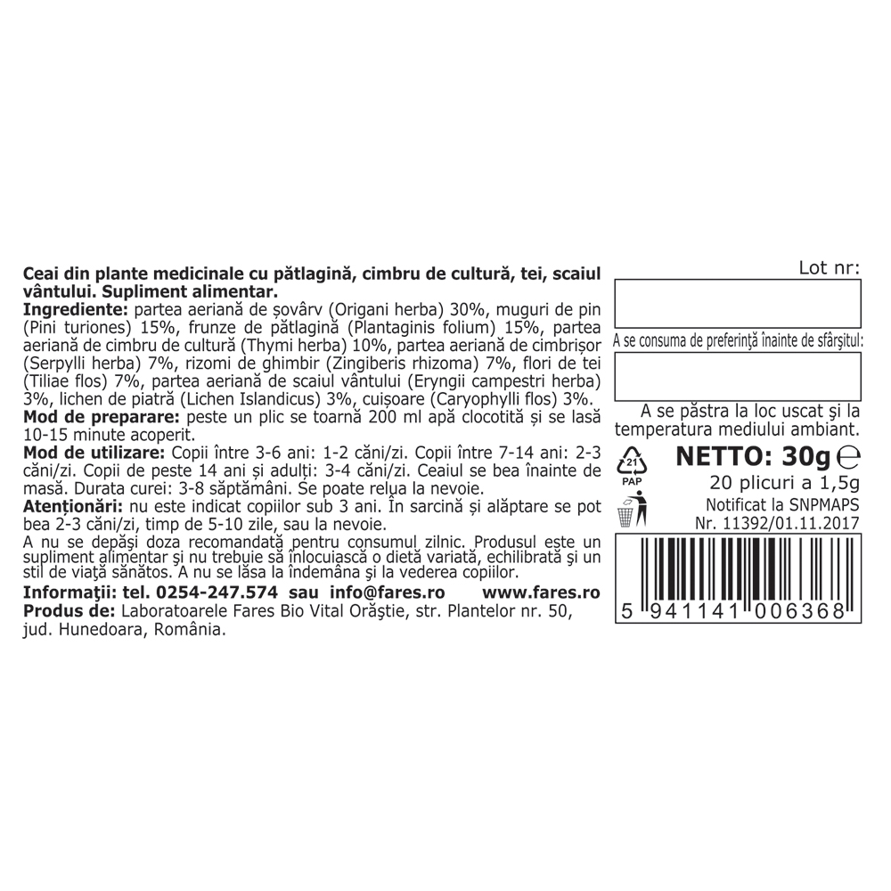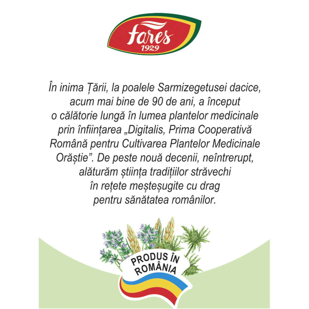 Ceaiul Plantusin R26 de la Fares este un amestec de plante medicinale atent selecționate, precum pătlagină, cimbru de cultură, tei, scaiul vântului și ghimbir. Contribuie la o stare generală de bine și la confortul respirator, fiind o alegere potrivită pentru susținerea organismului în sezonul rece.
