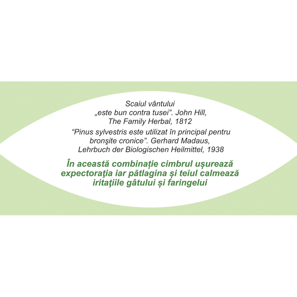 partea aeriană de șovârv (Origanum herba) 30%, muguri de pin (Pini turiones) 15%, frunze de pătlagină (Plantaginis folium) 15%, partea aeriană de cimbru de cultură (Thymi herba) 10%, partea aeriană de cimbrușor (Serypili herba) 7%, rizomi de ghimbir (Zingiberis rhizoma) 7%, flori de tei (Tiliae flos) 7%, partea aeriană de scaiul vântului (Eryngii campestri herba) 3%, lichen de piatră (Lichen Islandicus) 3%, cuișoare (Caryophylli flos) 3%