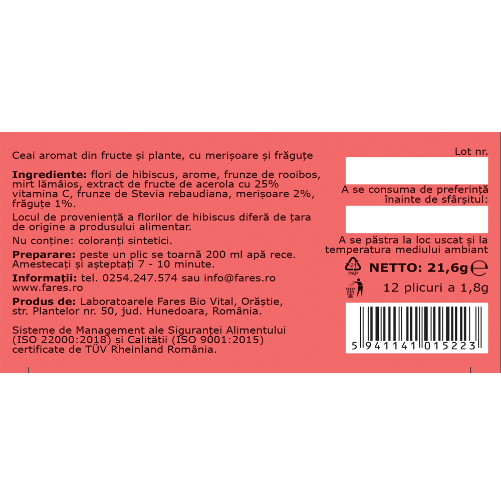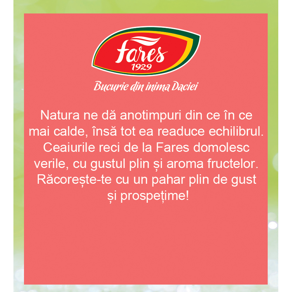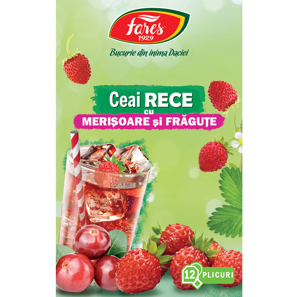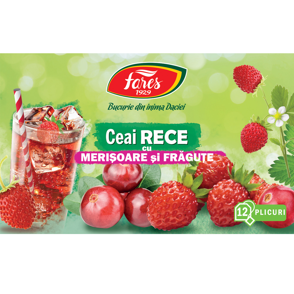 Ceaiul rece cu Merişoare şi Frăguţe de la Fares este un amestec aromat din fructe și plante, special conceput pentru a fi preparat cu apă rece. Combină gustul dulce și fin al frăguțelor cu notele acrișoare ale merișoarelor, oferind o băutură proaspătă și reconfortantă, perfectă pentru zilele calde.