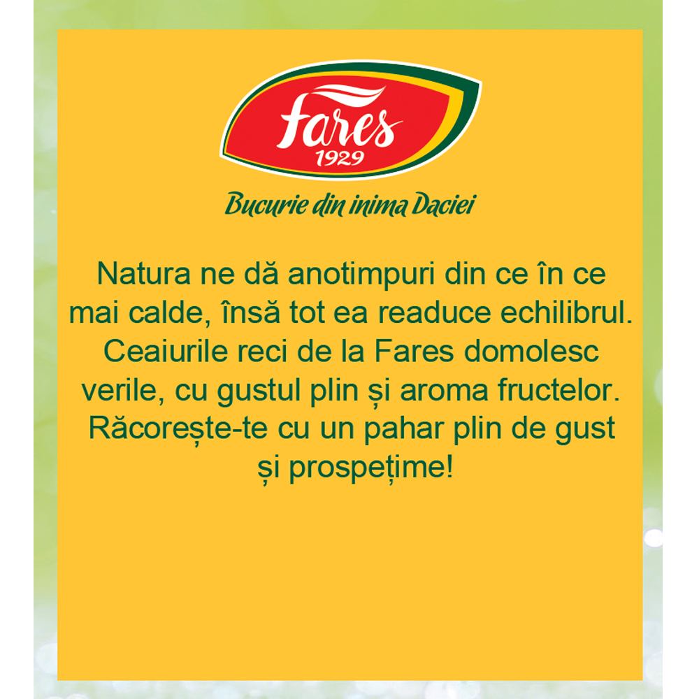 Ceaiul este un produs aromat din fructe și plante. Nu conține coloranți sintetici și este îndulcit cu frunze de Stevia rebaudiana.