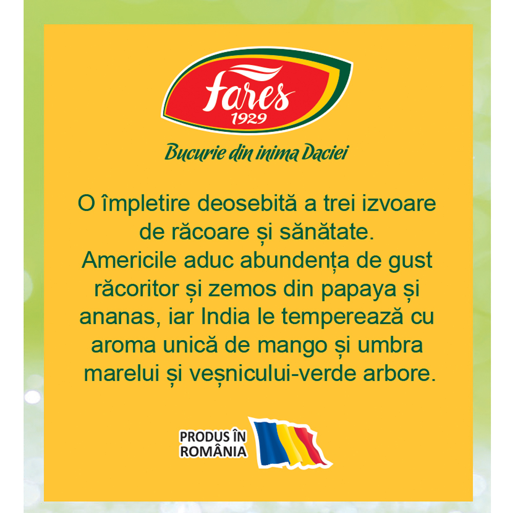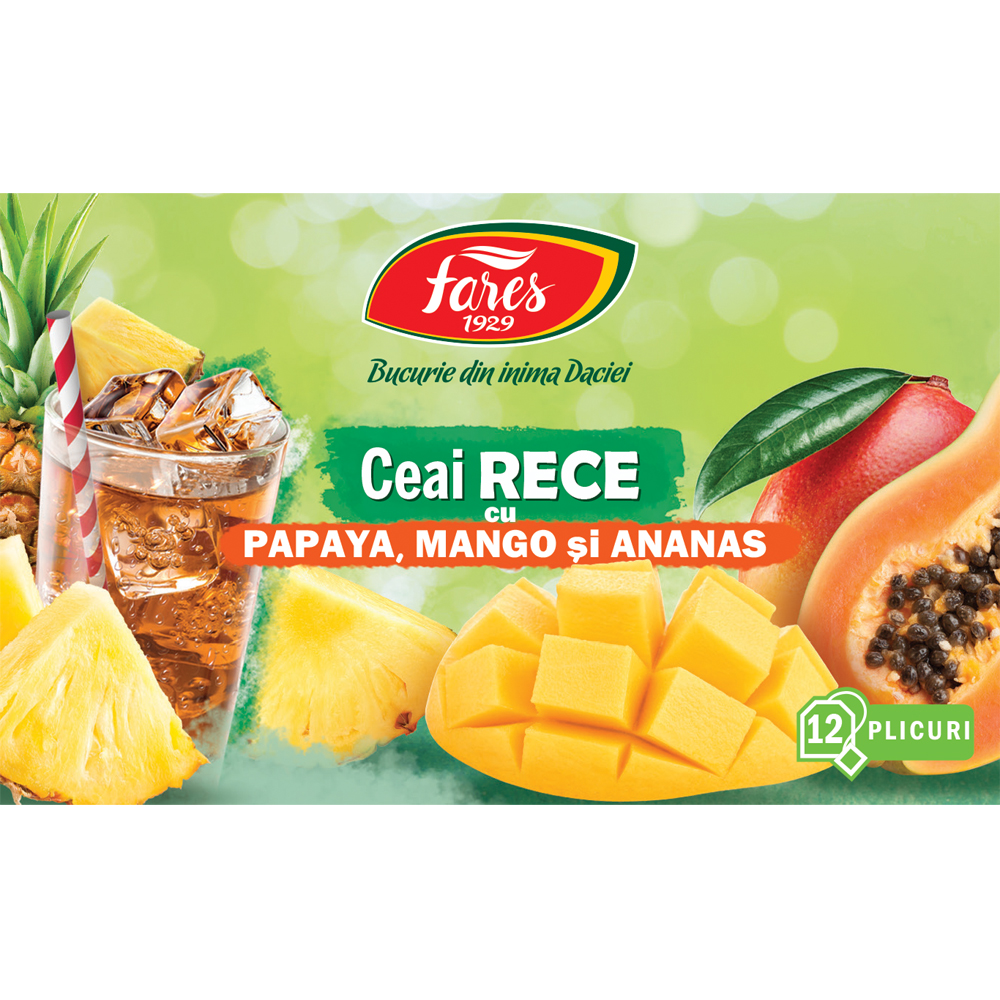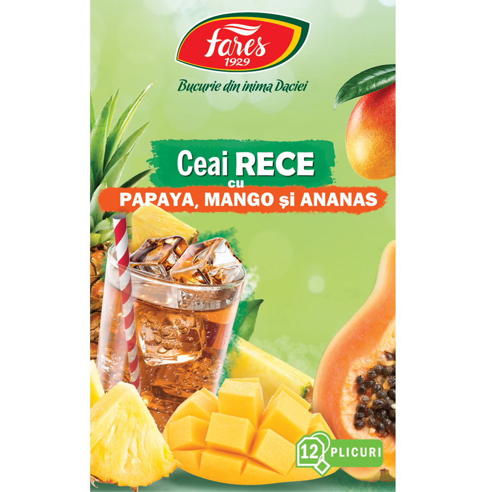 Ceaiul rece cu Papaya, Mango și Ananas de la Fares 1929 este un amestec aromat de fructe și plante, special creat pentru a fi preparat cu apă rece. Combină gustul exotic și zemos al fructelor tropicale, oferind o băutură proaspătă și reconfortantă, perfectă pentru zilele calde.