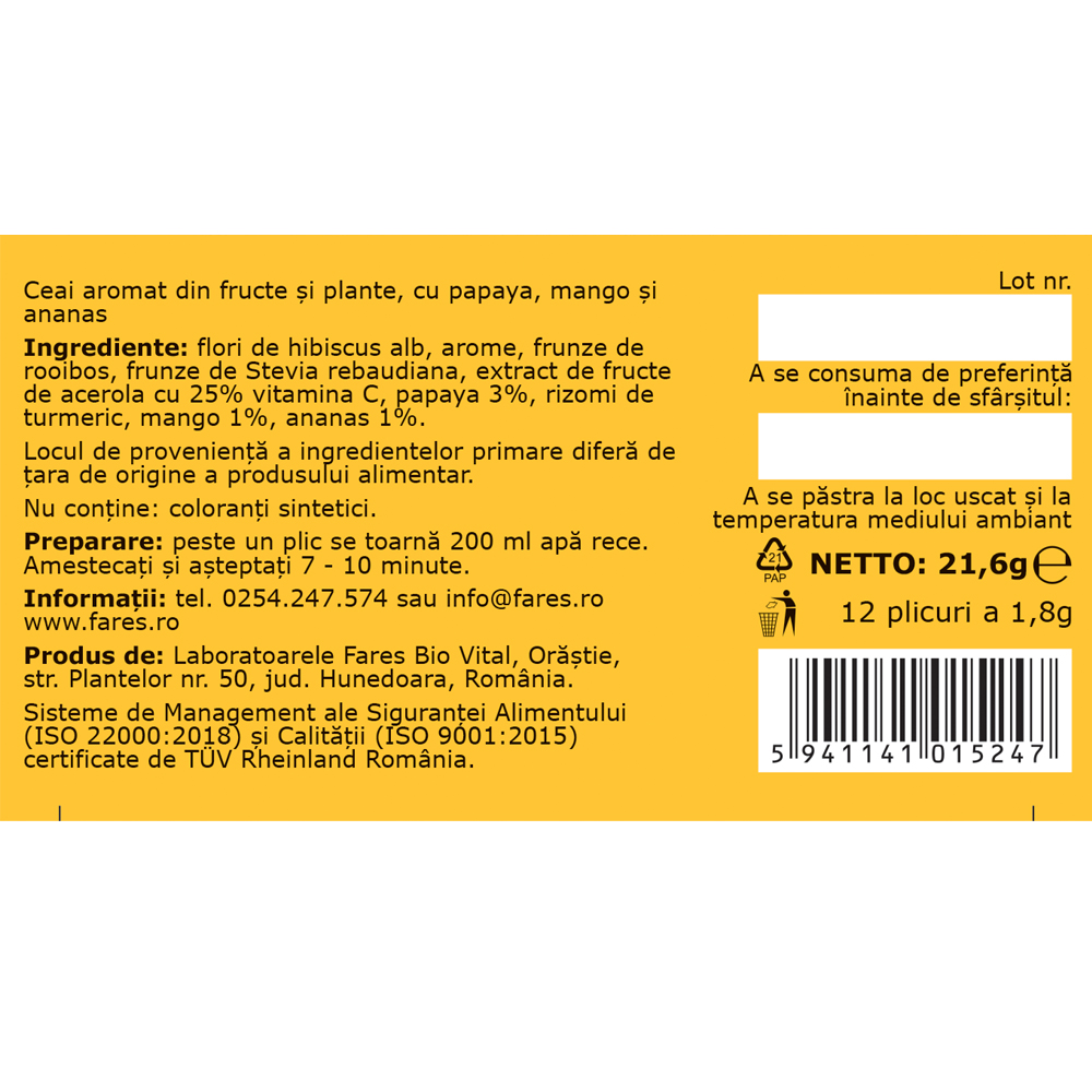 flori de hibiscus alb, arome, frunze de rooibos, frunze de Stevia rebaudiana, extract de fructe de acerola cu 25% vitamina C, papaya 3%, rizomi de turmeric, mango 1%, ananas 1%.