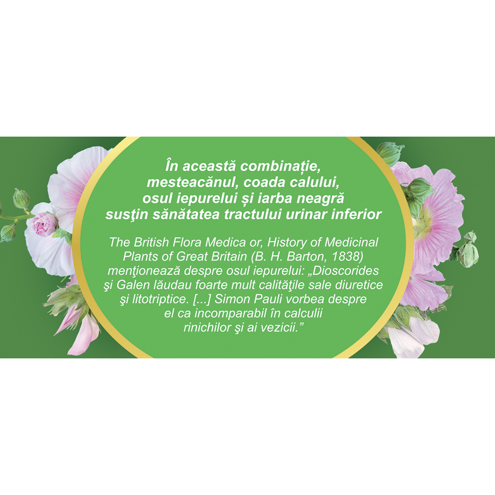 În această combinație, mesteacănul, coada calului, osul iepurelui și iarba neagră susţin sănătatea tractului urinar inferior.