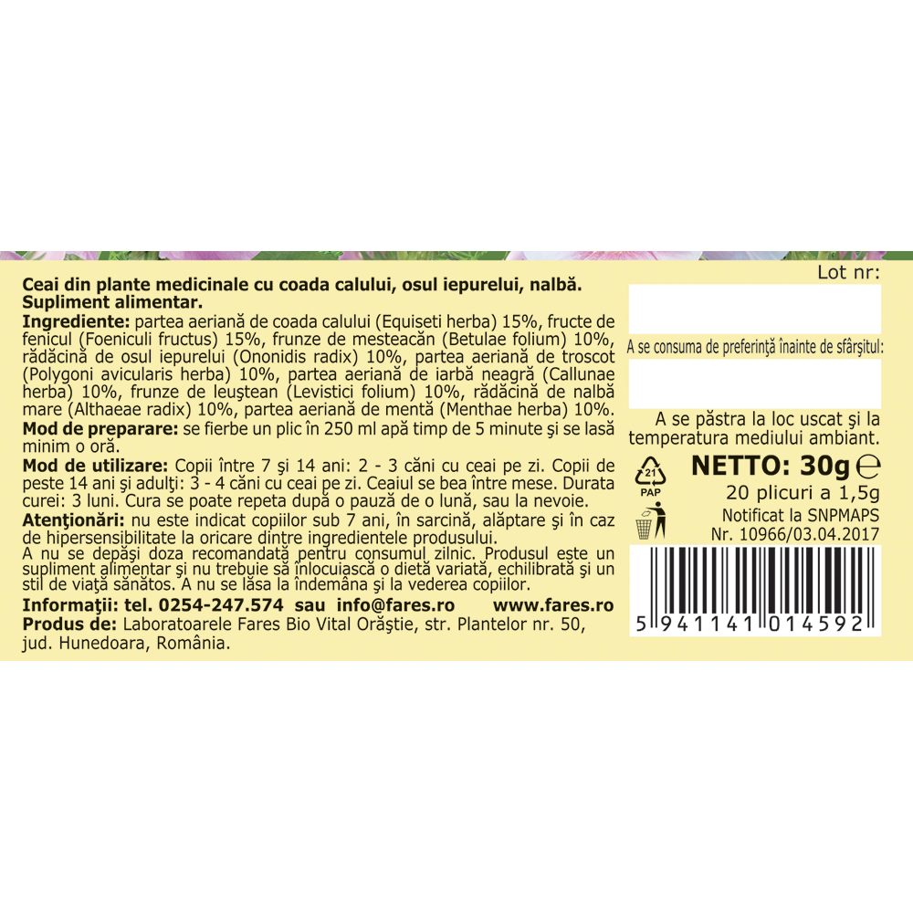 Coada calului (Equiseti herba), fructe de fenicul (Foeniculi fructus), frunze de mesteacăn (Betulae folium), rădăcină de osul iepurelui (Ononidis radix), troscot (Polygoni avicularis herba), iarbă neagră (Callunae herba), frunze de leuştean (Levistici folium), rădăcină de nalbă (Althaeae radix), mentă (Menthae herba).