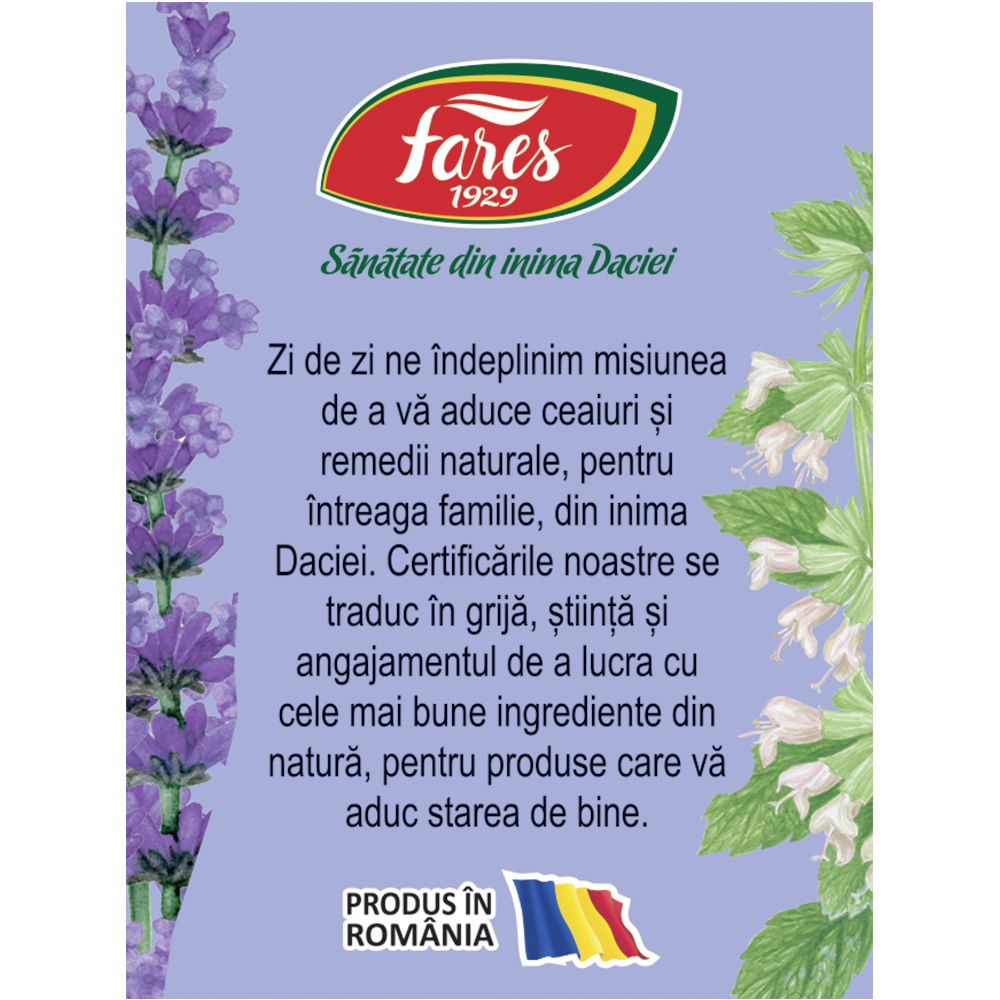 Ceaiul din plante medicinale cu roiniță, păducel și lavandă este o infuzie naturală, realizată dintr-un amestec echilibrat de plante și flori atent selecționate. Aroma sa fină combină notele florale de lavandă și mușețel cu gustul delicat al roiniței și al teiului, completate de prezența păducelului și a passiflorei. Este o băutură reconfortantă, ideală pentru momentele de relaxare de seară.
