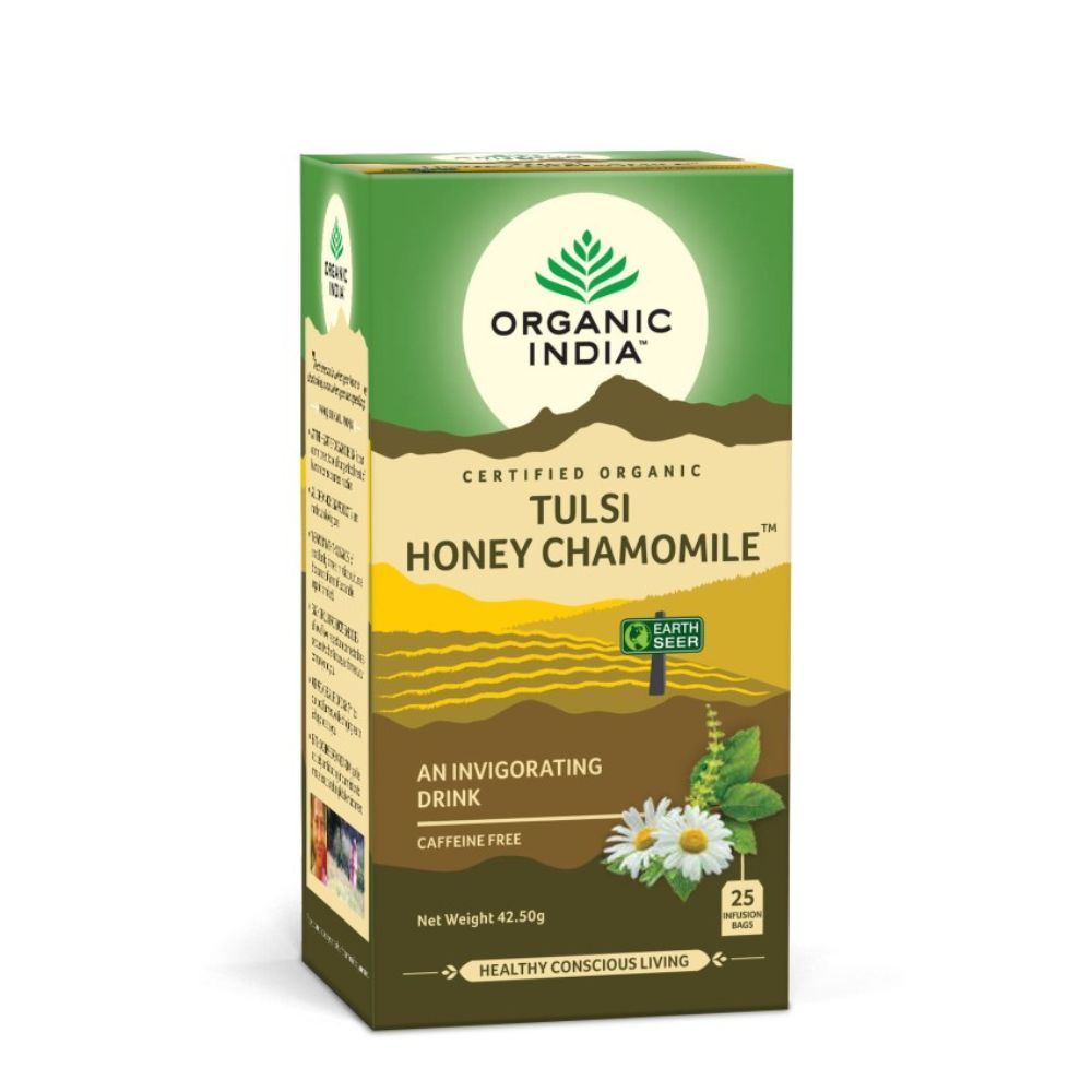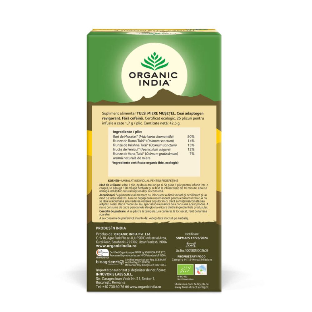 Supliment alimentar TULSI MIERE MUȘEȚEL. Ceai adaptogen revigorant. Fără cofeină. Certificat ecologic. 25 plicuri pentru infuzie 1,7 g / plic.
