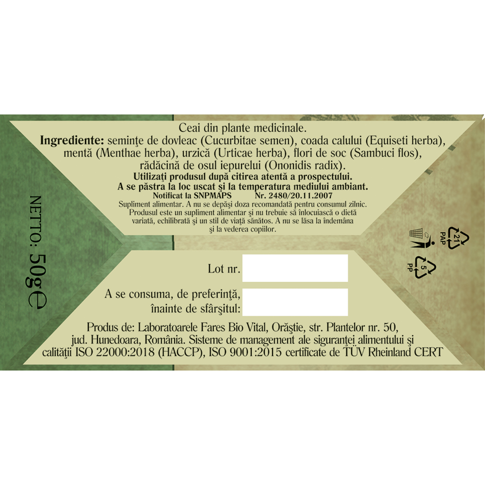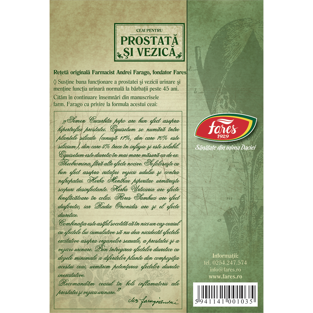 Ceaiul pentru prostată și vezică de la Fares este o rețetă, creată pe baza manuscriselor farmacistului Andrei Farago, fondatorul Fares. Acesta contribuie la sustinerea buneifunctionari a prostatei și a vezicii urinare și contribuie la menținerea unei funcții urinare normale la bărbații peste 45 de ani.