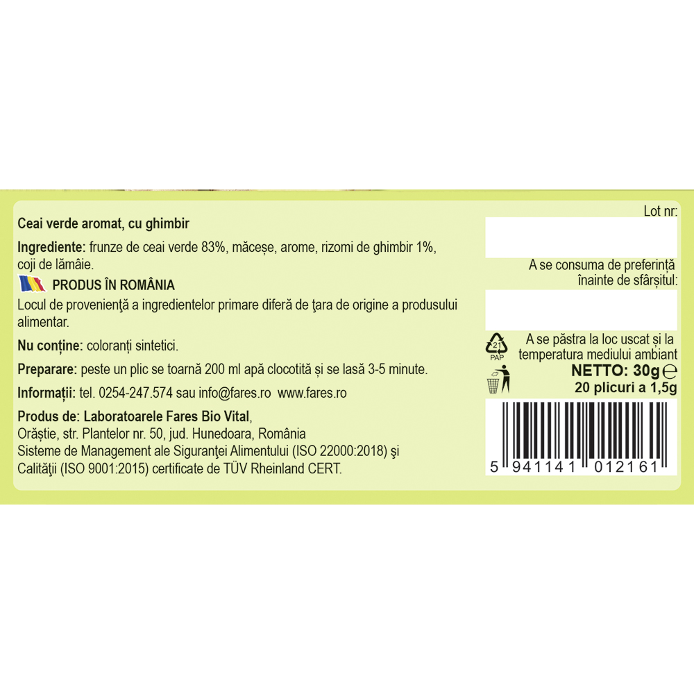 frunze de ceai verde 83%, măceșe, arome, rizomi de ghimbir 1%, coji de lămâie.
