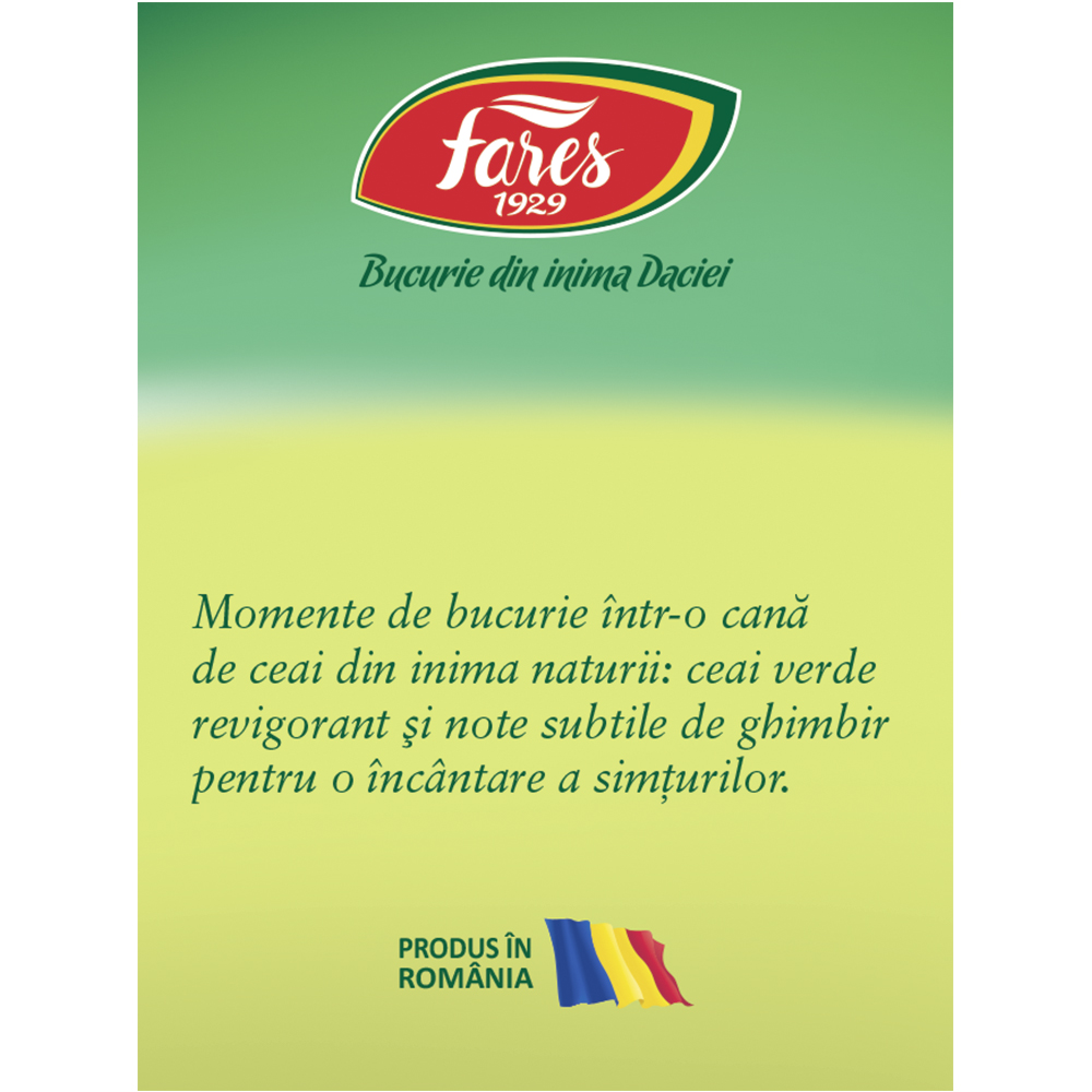 Ceaiul verde cu ghimbir de la Fares 1929 este un amestec aromat, cu o bază de ceai verde și note subtile de ghimbir. Este o băutură cu un gust echilibrat și revigorant.