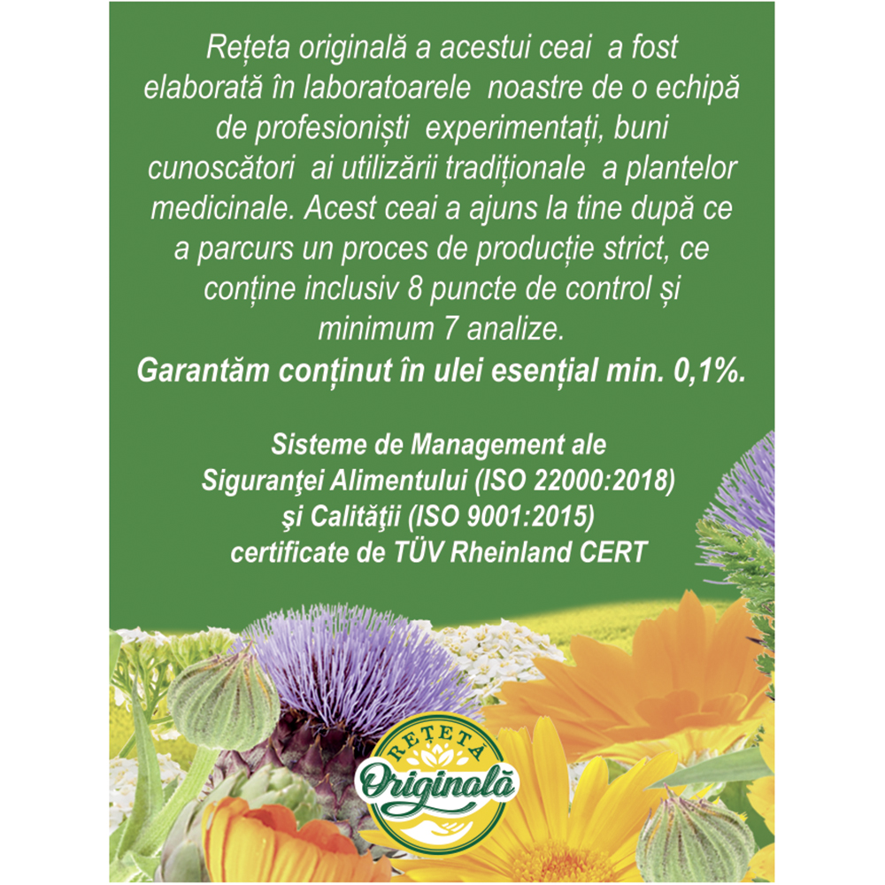 Mod de preparare: Peste un plic de ceai se toarnă 200 ml de apă clocotită. Se lasă la infuzat timp de 10-15 minute acoperit, apoi se consumă.