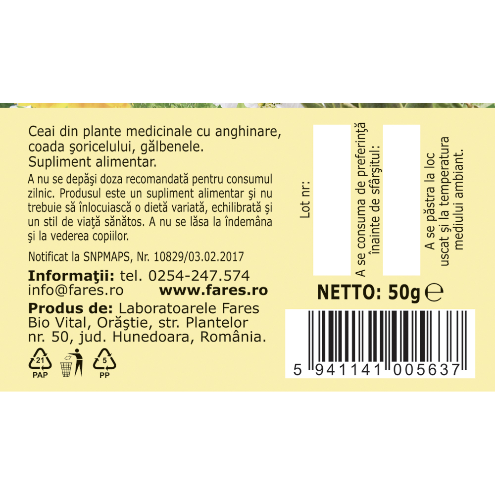 Ceaiul pentru vezica biliară D75 de la Fares este un supliment alimentar pe bază de plante atent selecționate, precum sunătoare, gălbenele, anghinare și coada-șoricelului. Susține confortul digestiv și contribuie la menținerea funcțiilor biliare normale.