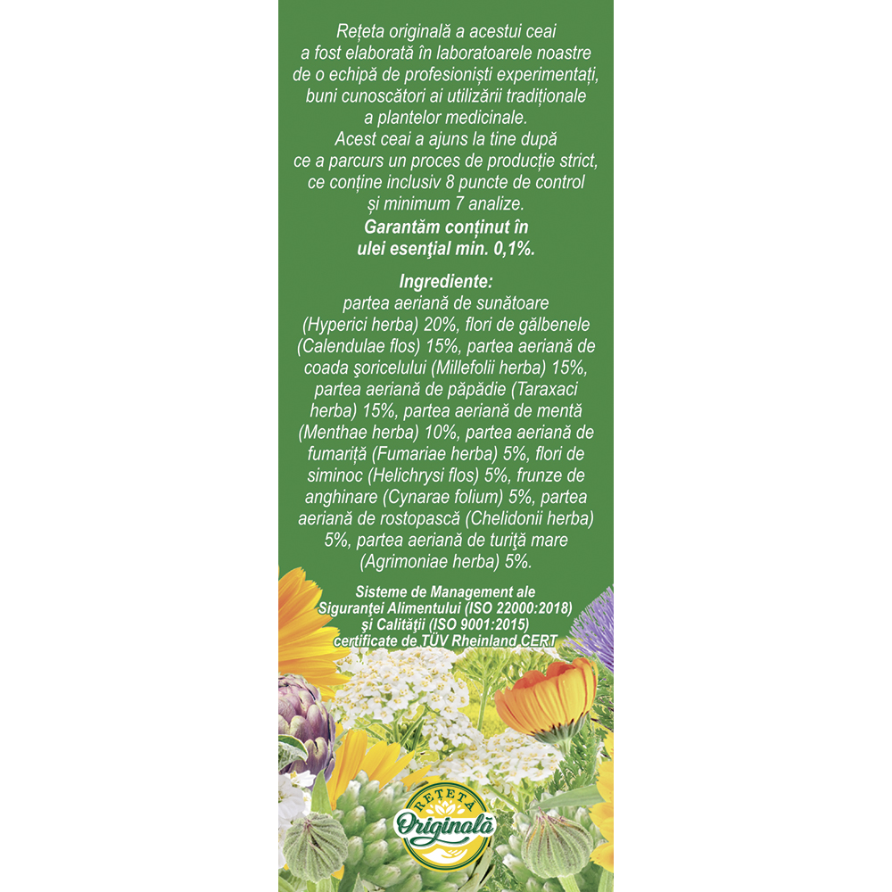 partea aeriană de sunătoare (Hyperici herba) 20%, flori de gălbenele (Calendulae flos) 15%, partea aeriană de coada șoricelului (Millefolii herba) 15%, partea aeriană de păpădie (Taraxaci herba) 15%, partea aeriană de mentă (Menthae herba) 10%, partea aeriană de fumăriță (Fumariae herba) 5%, flori de siminoc (Helichrysi flos) 5%, frunze de anghinare (Cynarae folium) 5%, partea aeriană de rostopască (Chelidonii herba) 5%, partea aeriană de turiță mare (Agrimoniae herba) 5%