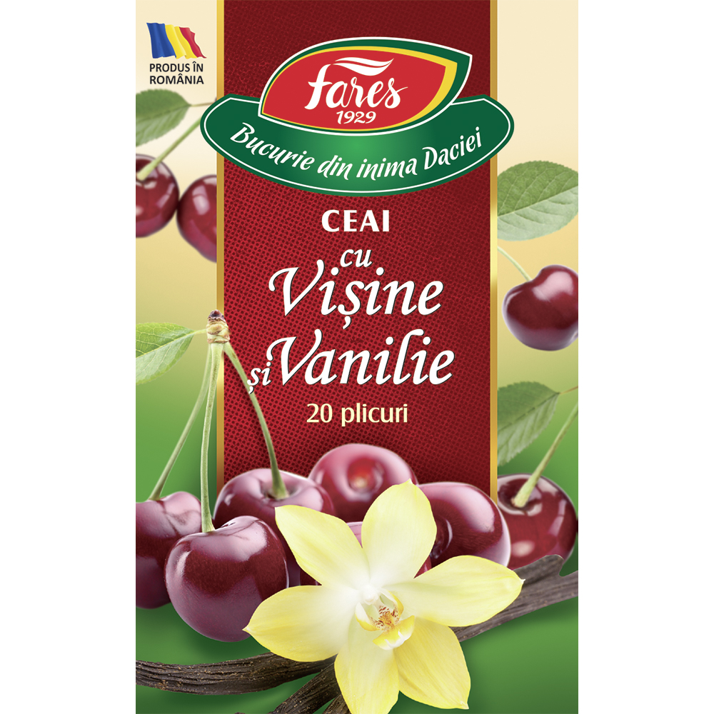 Ceai aromat cu vișine și vanilie, obținut dintr-un amestec de fructe și plante. Oferă un gust proaspăt, echilibrat între aroma acrișoară a vișinelor și parfumul delicat de vanilie.