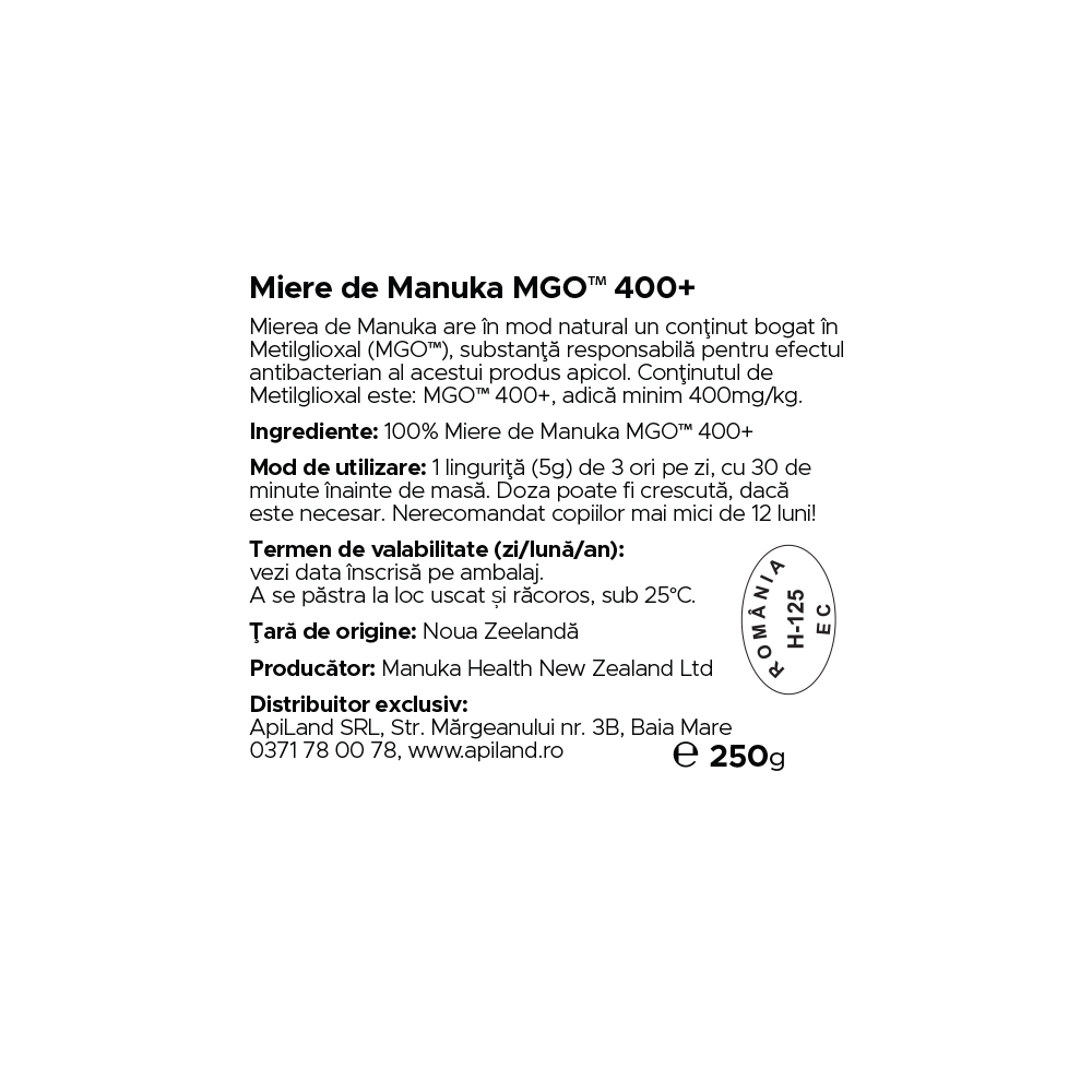 Mierea de Manuka are în mod natural un conţinut bogat în Metilglioxal (MGO™), substanţă responsabilă pentru efectul antibacterian al acestui produs apicol. Conținutul de Metilglioxal (MGO™) din acest tip de miere este de MGO™ 400+, adică minim 400mg/kg.