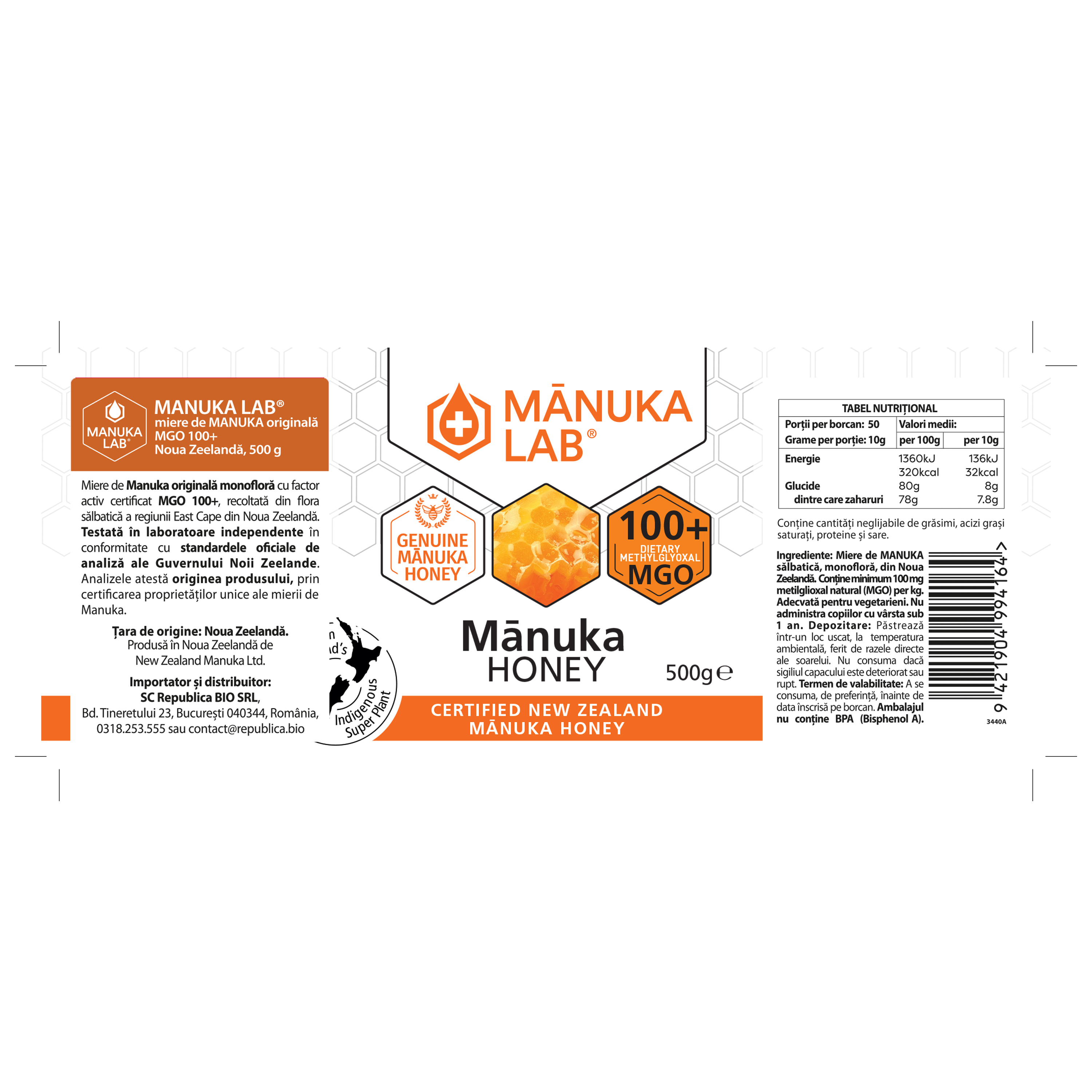 Un borcan contine 500g miere de Manuka monoflora MGO 100+, produs natural.