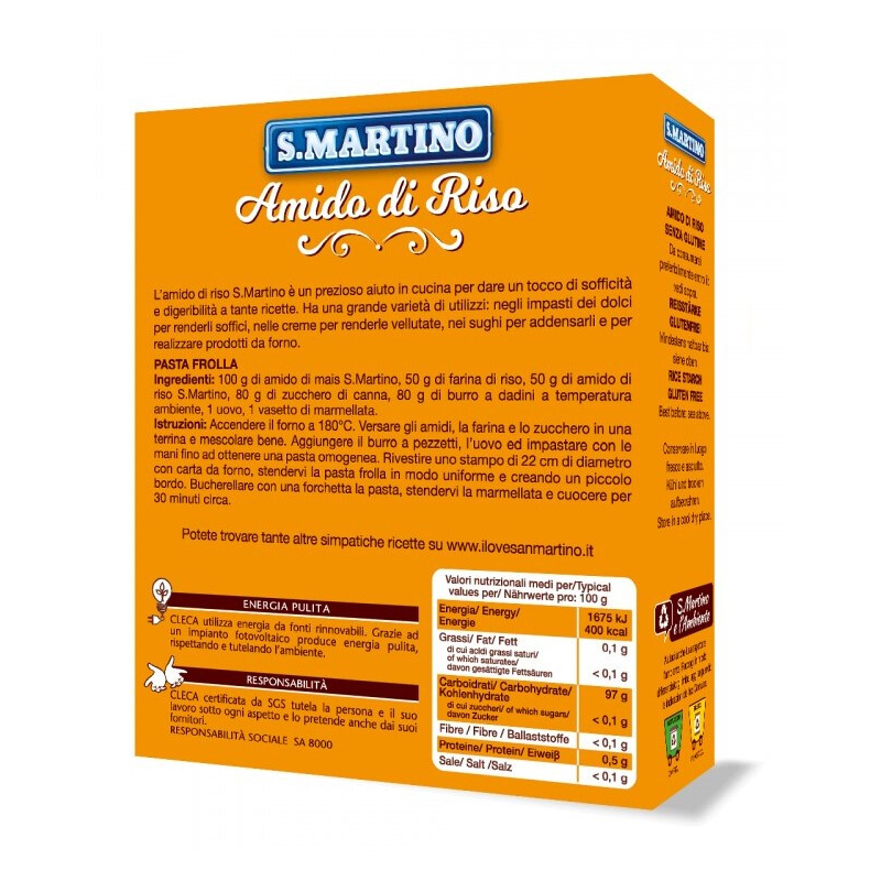 Amidonul de orez S.Martino este un ingredient alimentar fin, obtinut din orez, apreciat pentru textura delicata pe care o ofera preparatelor culinare. Este ideal pentru obtinerea unor aluaturi mai pufoase, creme mai catifelate si sosuri cu consistenta uniforma. Datorita digestibilitatii sale usoare, este potrivit si pentru alimentatia persoanelor cu sensibilitate la gluten.