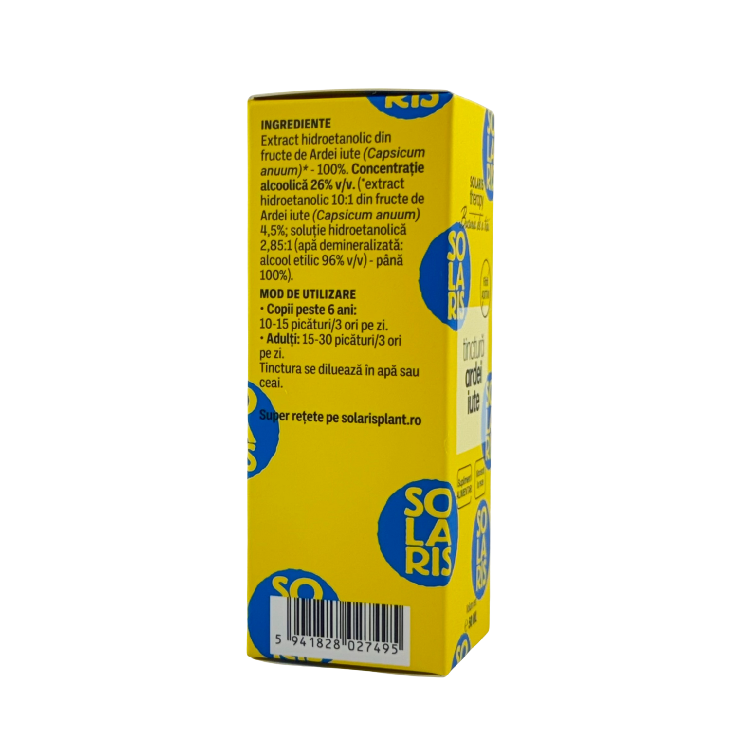26% v/v. (*extract hidroetanolic 10:1 din fructe de Ardei iute (Capsicum anuum) 4,5%; soluție hidroetanolică 2,85:1 (apă demineralizată:alcool etilic 96% v/v) până 100%).