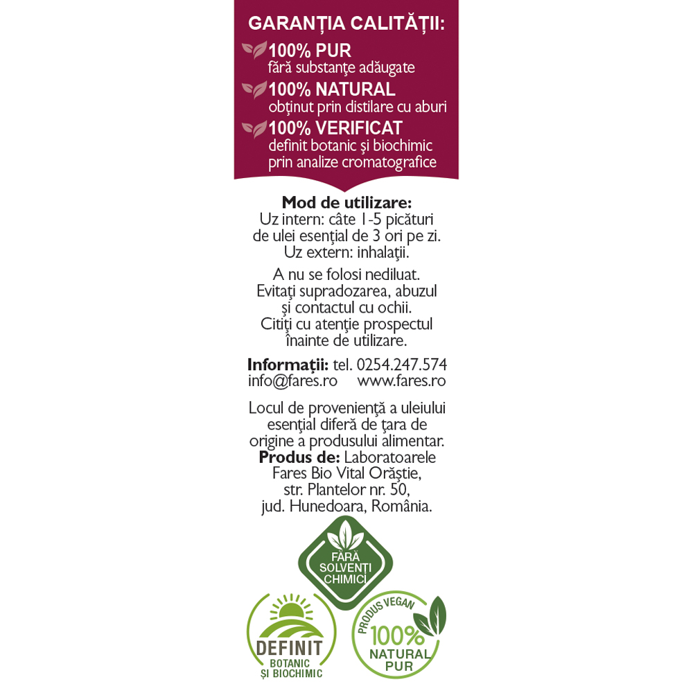 Ulei esențial de cimbru Fares A6 – 100% pur, natural, obținut prin distilare cu aburi din planta Thymus vulgaris. Produs definit botanic și biochimic, potrivit pentru uz intern și extern.