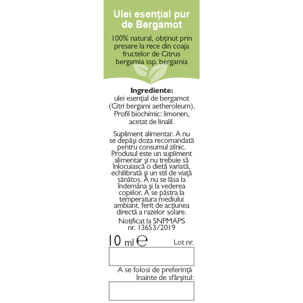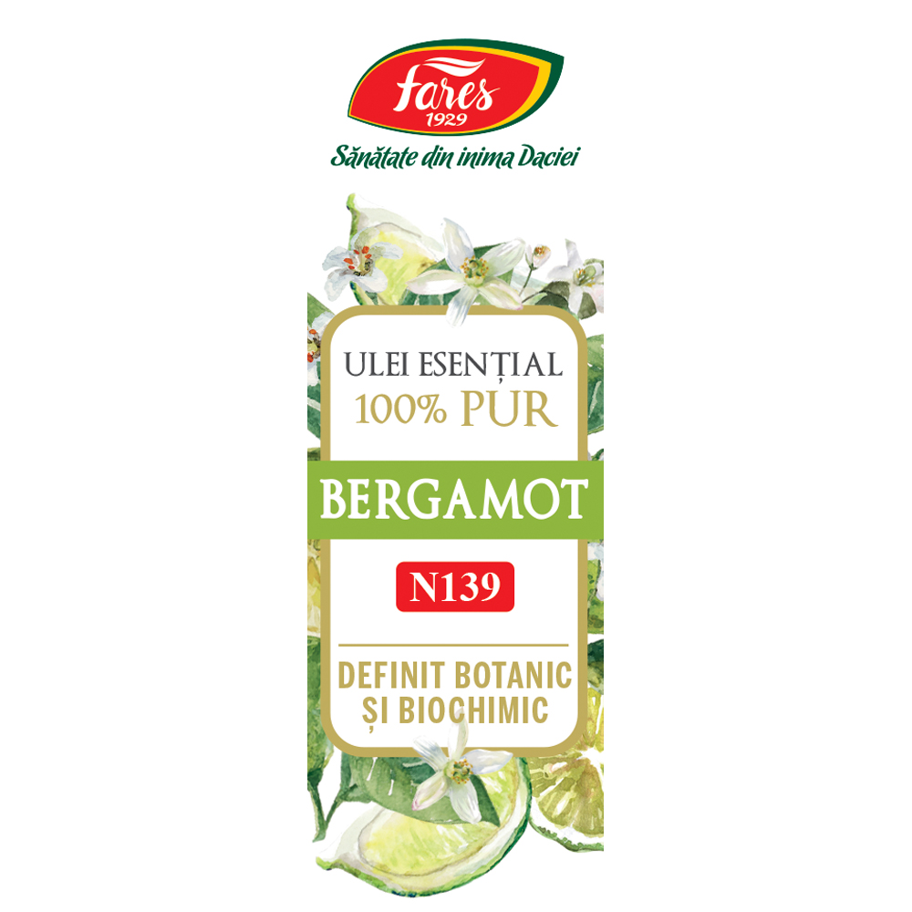 Ulei esențial de bergamot (Citri bergami aetheroleum), obţinut prin presare la rece din coaja fructelor coapte de Citrus bergamia ssp. bergamia.