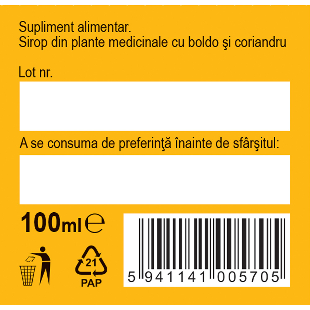Miere de albine min. 63%, extract apos de plante min. 35% (frunze de boldo 1,5%, frunze de nuc, rădăcină de iarbă mare, fructe de coriandru 0,5%, fructe de anason), vitamina C, extract hidroglicolic de propolis 0,45%, sorbat de potasiu (conservant).