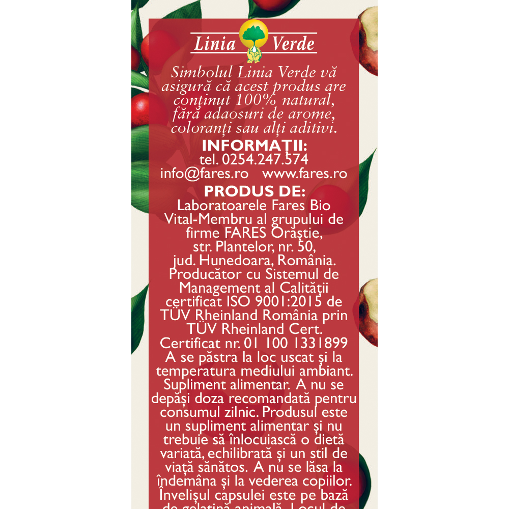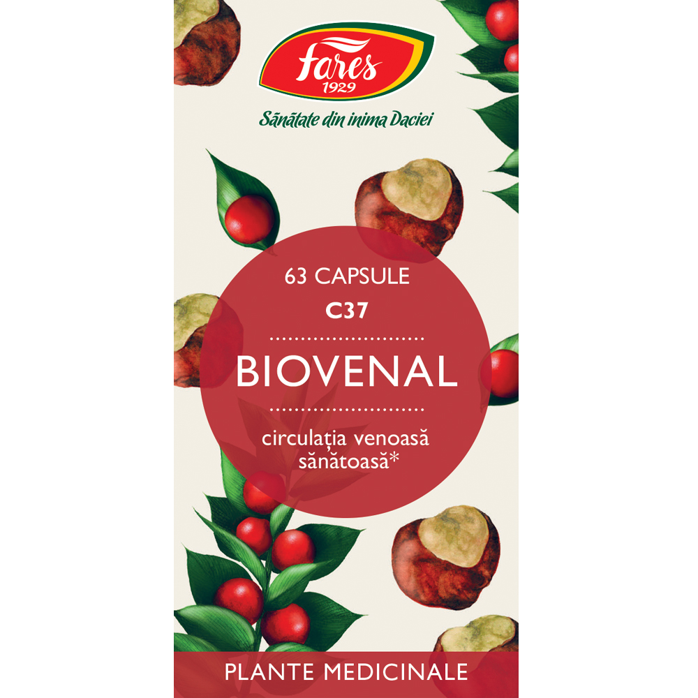Fares Biovenal C37 este un supliment alimentar pe bază de extracte și plante medicinale, printre care se regăsesc ghimpele și castanul sălbatic, ce contribuie la menținerea unei circulații venoase sănătoase. Produsul face parte din gama Linia Verde, cu ingrediente atent selecționate și procesate.
