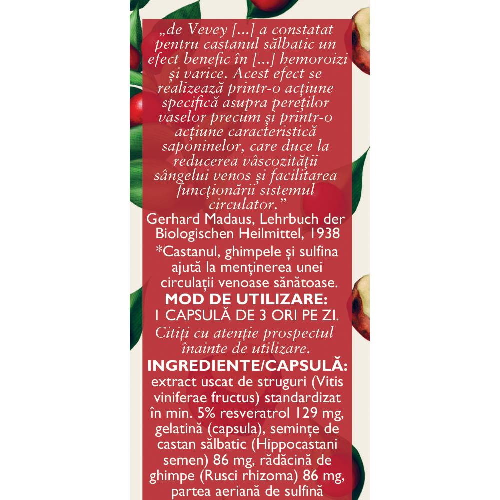 extract uscat de struguri (Vitis viniferae fructus) standardizat în min. 5% resveratrol 129 mg, gelatină (capsulă), semințe de castan sălbatic (Hippocastani semen) 86 mg, rădăcină de ghimpe (Rusci rhizoma) 86 mg, parte aeriană de sulfină (Meliloti herba) 86 mg