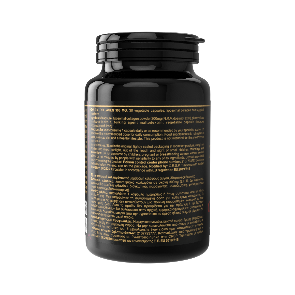 colagen lipozomal sub formă de pulbere 300 mg (VNR nu a fost stabilit), fosfolipide (lecitină din floarea-soarelui), agent de încărcare (maltodextrină), capsulă vegetală (hidroxipropilmetilceluloză).