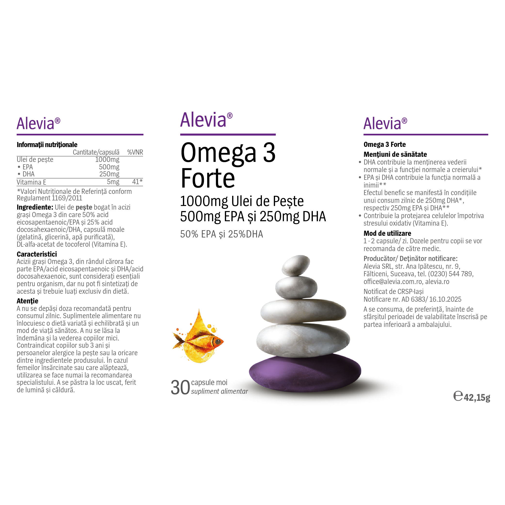 Omega 3 Forte Alevia este un supliment alimentar pe bază de ulei de pește, cu un conținut ridicat de acizi grași esențiali EPA (acid eicosapentaenoic) și DHA (acid docosahexaenoic), completat cu vitamina E.
