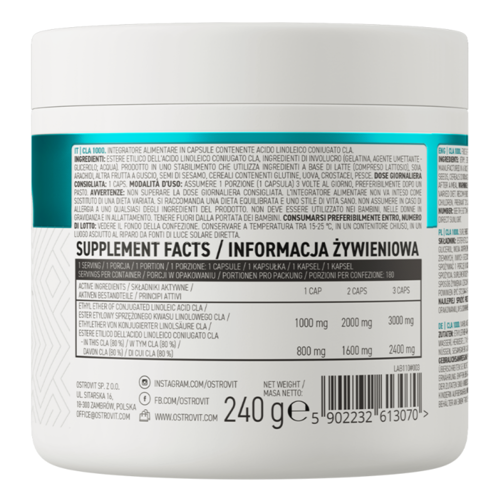 OstroVit CLA 1000 este un supliment alimentar care conține acid linoleic conjugat (CLA) sub formă de ester etilic. CLA este un acid gras din familia omega-6, utilizat frecvent în suplimentele destinate persoanelor active și celor care doresc să își completeze dieta cu acizi grași valoroși.