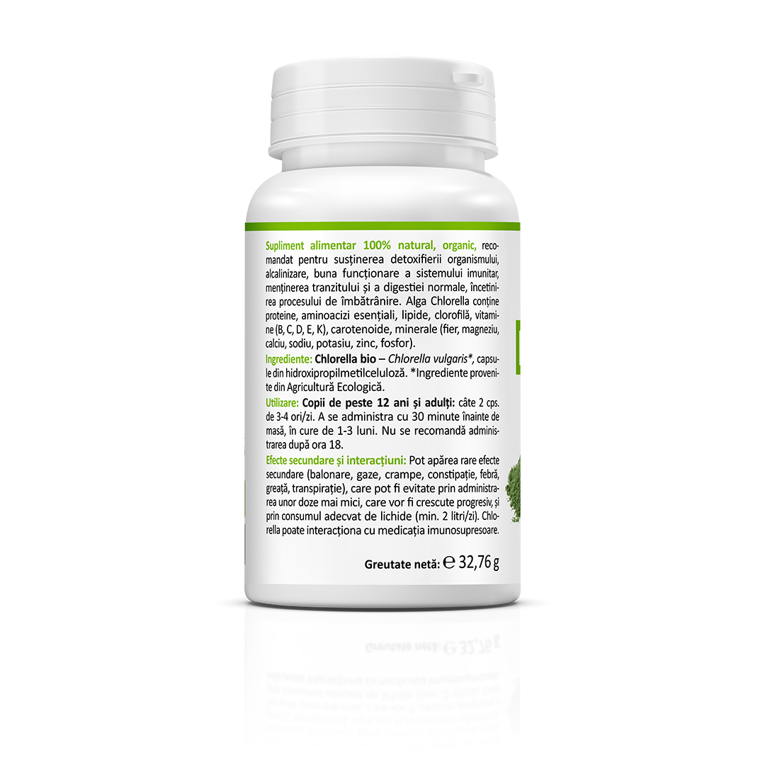 Supliment alimentar 100% natural și organic pe bază de Chlorella, recomandat pentru susținerea detoxifierii organismului, alcalinizare, buna funcționare a sistemului imunitar și menținerea tranzitului și a digestiei normale. Alga Chlorella conține proteine, aminoacizi esențiali, lipide, clorofilă, vitamine (B, C, D, E, K), carotenoide și minerale precum fier, magneziu, calciu, sodiu, potasiu, zinc și fosfor.
