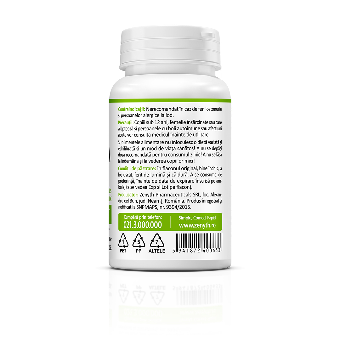 Nerecomandat în caz de fenilcetonurie și persoanelor alergice la iod. Copiii sub 12 ani, femeile însărcinate sau care alăptează și persoanele cu boli autoimune sau afecțiuni acute vor consulta medicul înainte de utilizare. Suplimentele alimentare nu înlocuiesc o dietă variată și echilibrată și un mod de viață sănătos. A nu se depăși doza recomandată pentru consumul zilnic. A nu se lăsa la îndemâna și la vederea copiilor mici.boli autoimune sau afecțiuni acute vor consulta medicul înainte de utilizare.