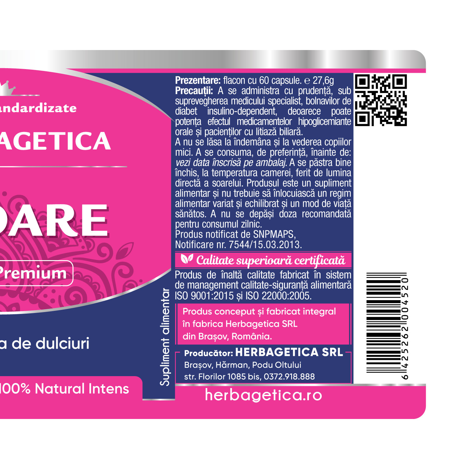 Produsul este un supliment alimentar și nu trebuie să înlocuiască un regim alimentar variat și echilibrat și un mod de viață sănătos.