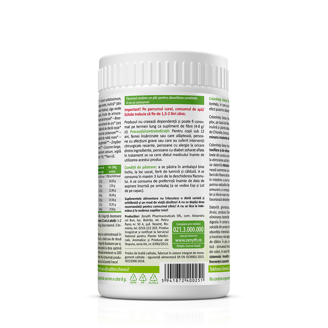 Supliment alimentar ColonHelp Detox Forte cu fibre, inulină și plante, pentru susținerea tranzitului intestinal și echilibrului digestiv.