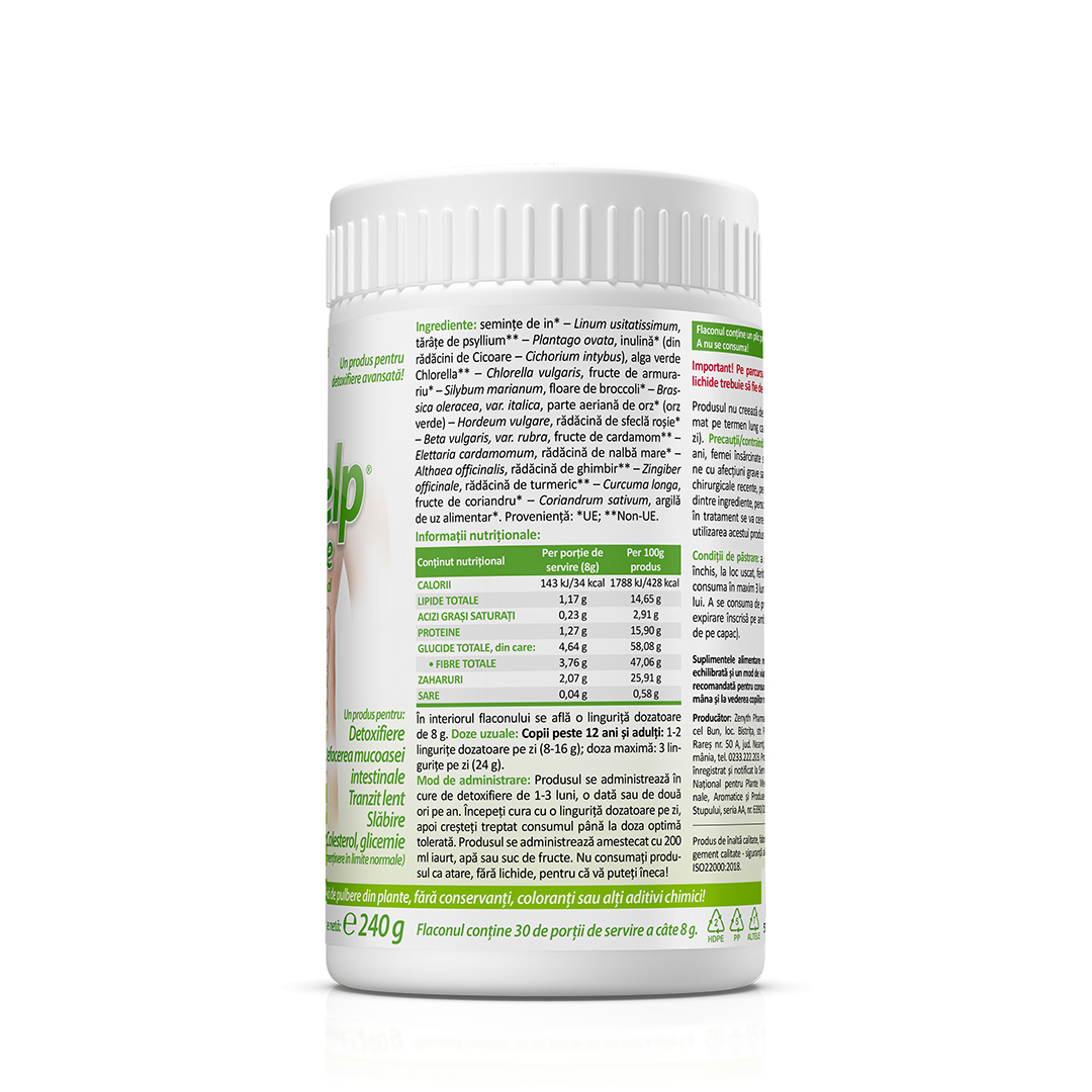 semințe de in (linum usitatissimum), tărâțe de psyllium (plantago ovata), inulină (din rădăcină de cicoare – cichorium intybus), chlorella (chlorella vulgaris), fructe de armurariu (silybum marianum), broccoli (brassica oleracea), orz verde (hordeum vulgare), rădăcină de sfeclă roșie (beta vulgaris), fructe de cardamom (elettaria cardamomum), rădăcină de nalbă mare (althaea officinalis), rădăcină de ghimbir (zingiber officinale), rădăcină de turmeric (curcuma longa), fructe de coriandru (coriandrum sativum), argilă de uz alimentar