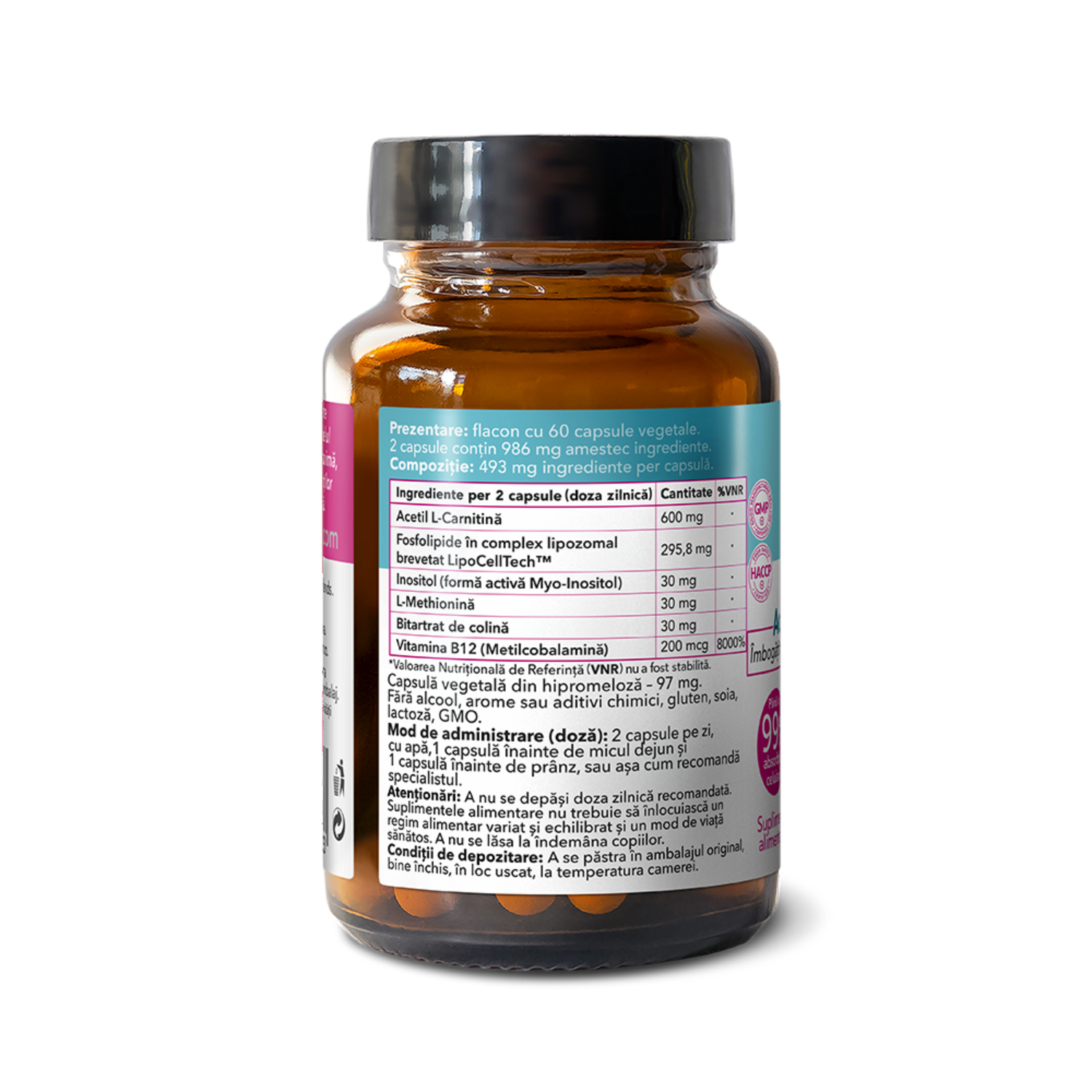 Compoziție per 2 capsule (doza recomandată): Acetil L-Carnitină 600 mg, fosfolipide în complex lipozomal brevetat LipoCellTech™ 295,8 mg, Inositol (formă activă Myo-Inositol) 30 mg, L-Methionină 30 mg, Bitartrat de colină 30 mg, Vitamina 12 (metilcobalamină) 200 mcg (8000%*),. Capsulă 100% vegetală din hidroxipropilmetilceluloză. *Valoarea Nutrițională de Referință.