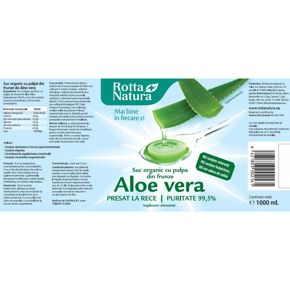 Ultima actualizare a informatiilor de prezentare pentru Suc organic de Aloe Vera cu pulpa, 1000 ml, Rotta Natura a fost efectuata la data de 14-11-2025.  |  Raporteaza Descriere Gresita