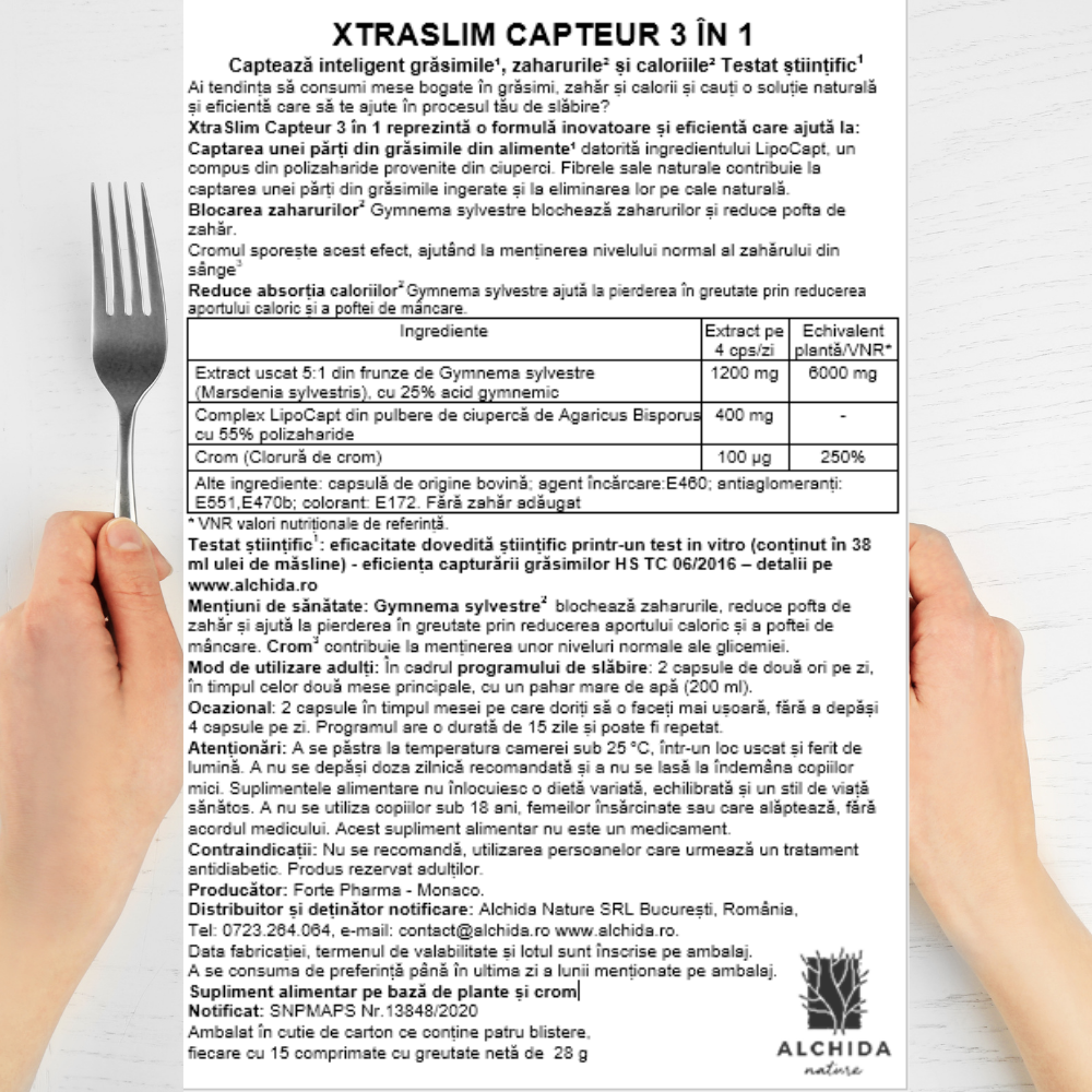 Mențiuni de sănătate: Gymnema sylvestre2 blochează zaharurile, reduce pofta de zahăr și ajută la pierderea în greutate prin reducerea aportului caloric și a poftei de mâncare. Crom3 contribuie la menținerea unor niveluri normale ale glicemiei.